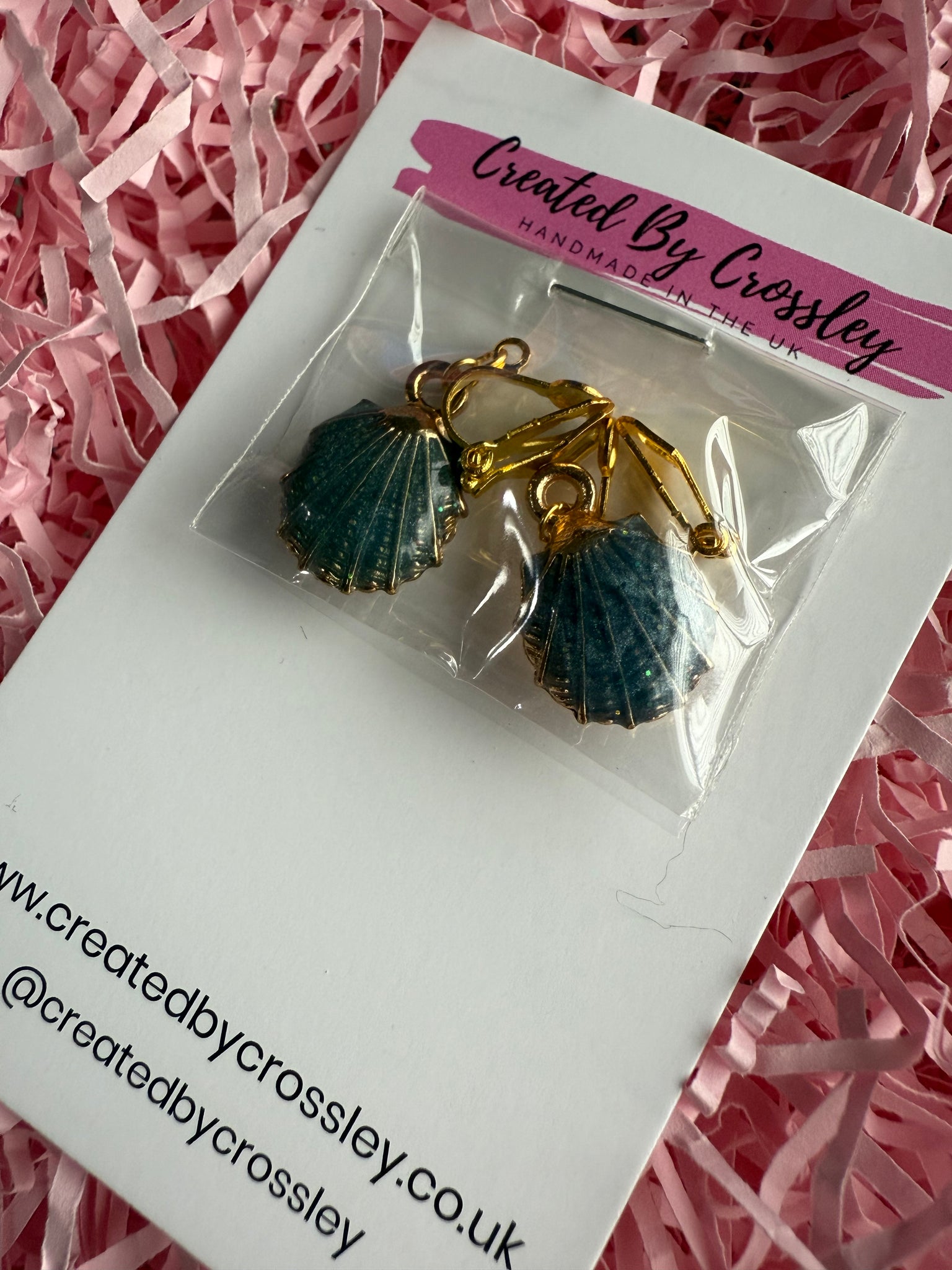 Sparkly blue beach shell charm clip on earrings, perfect for those with non pierced ears!