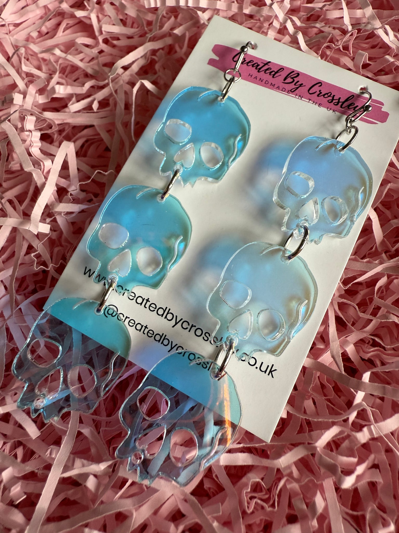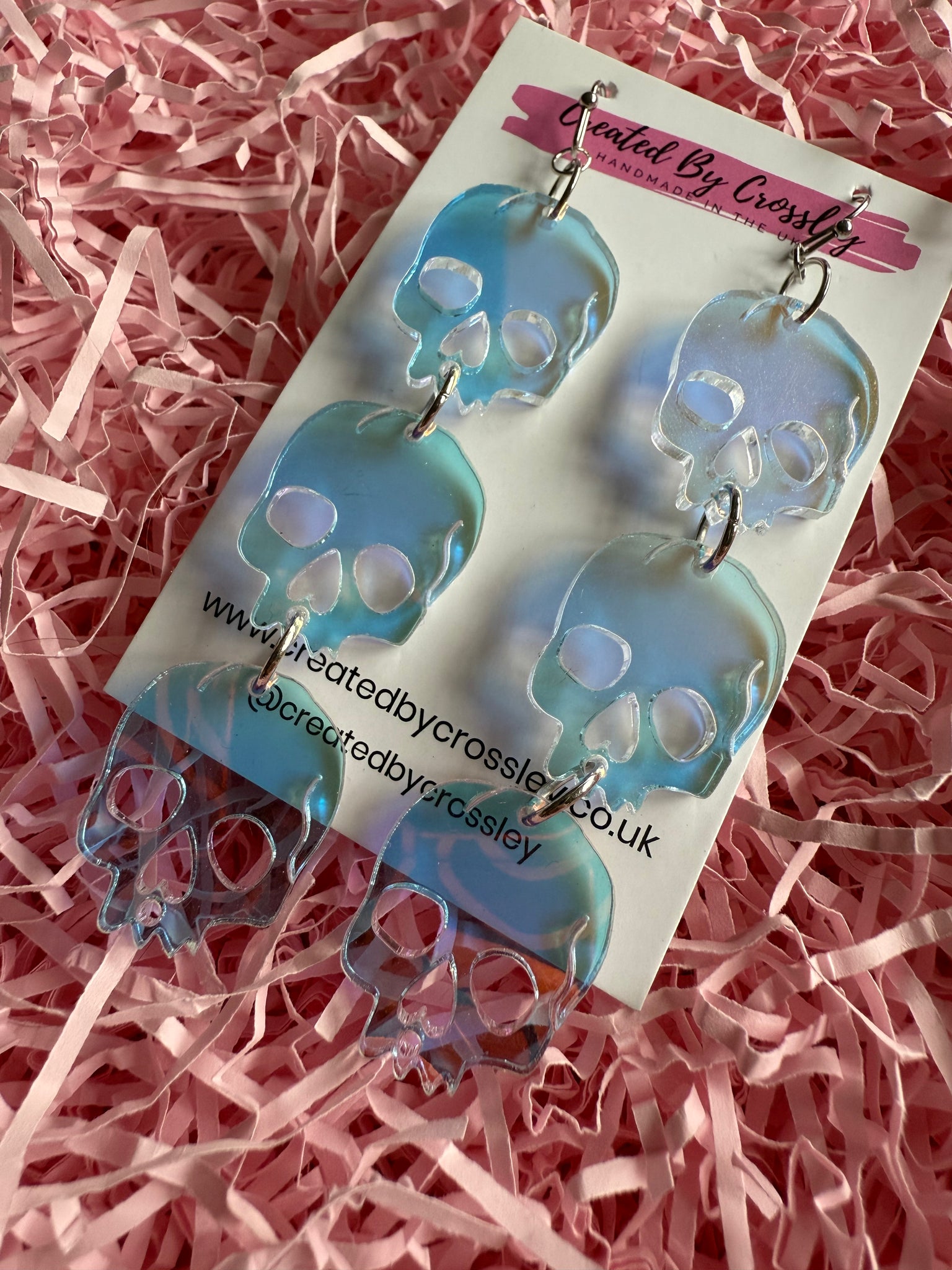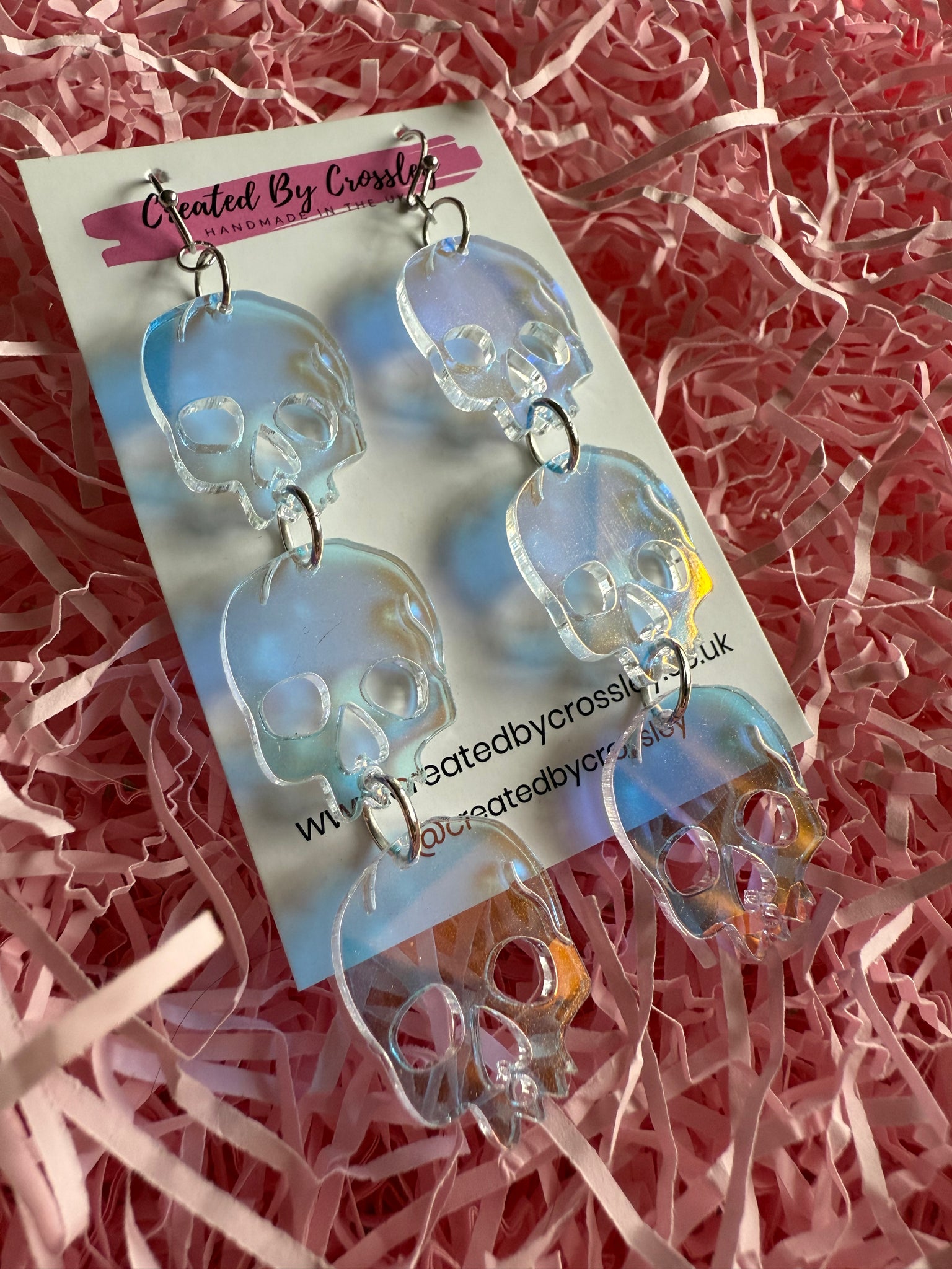 Holographic/clear trio of skulls earrings, perfect for Halloween or accessorising spooky season outfits!