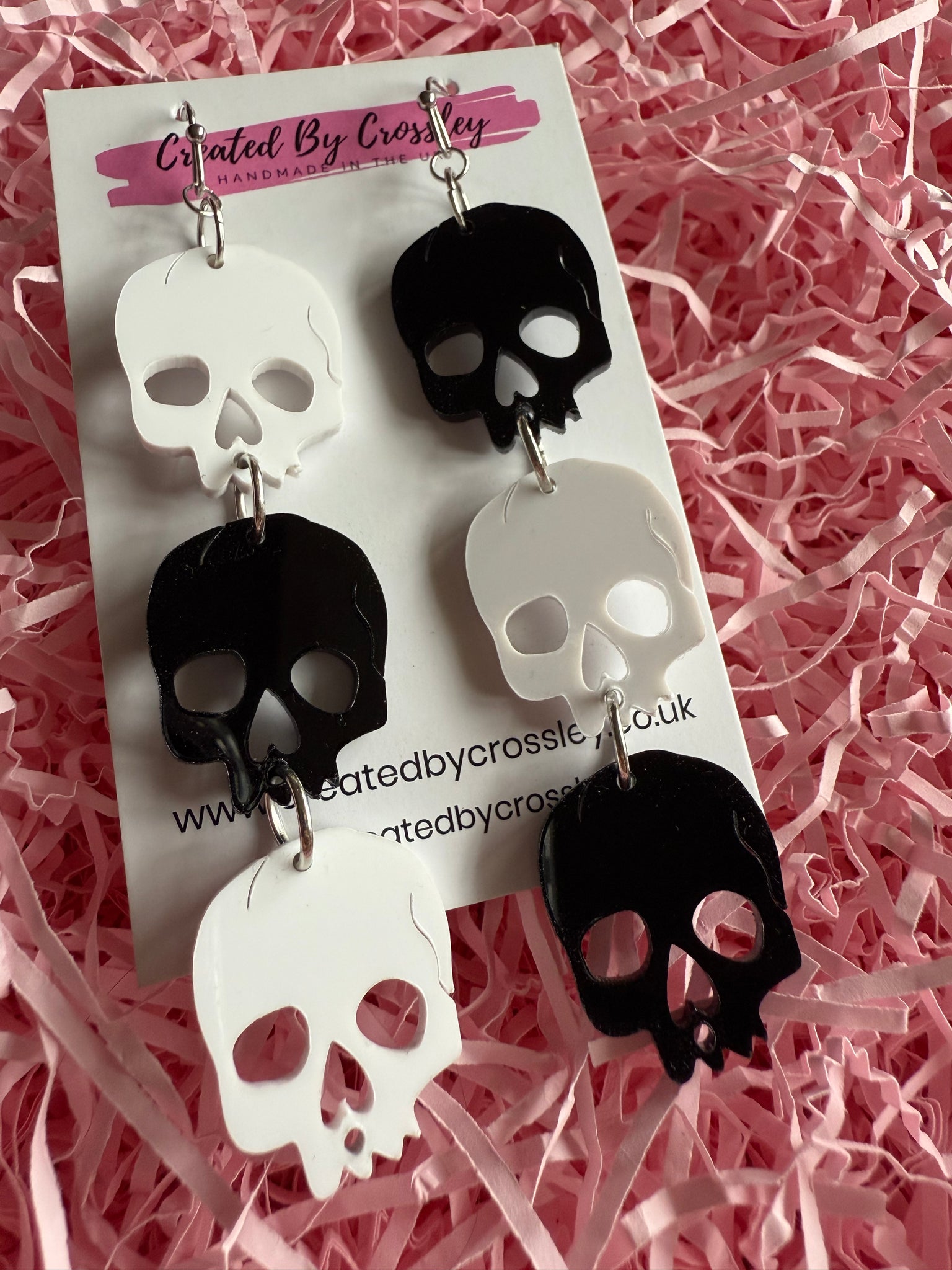 Black and white trio of skulls earrings, perfect for Halloween or accessorising spooky season outfits!