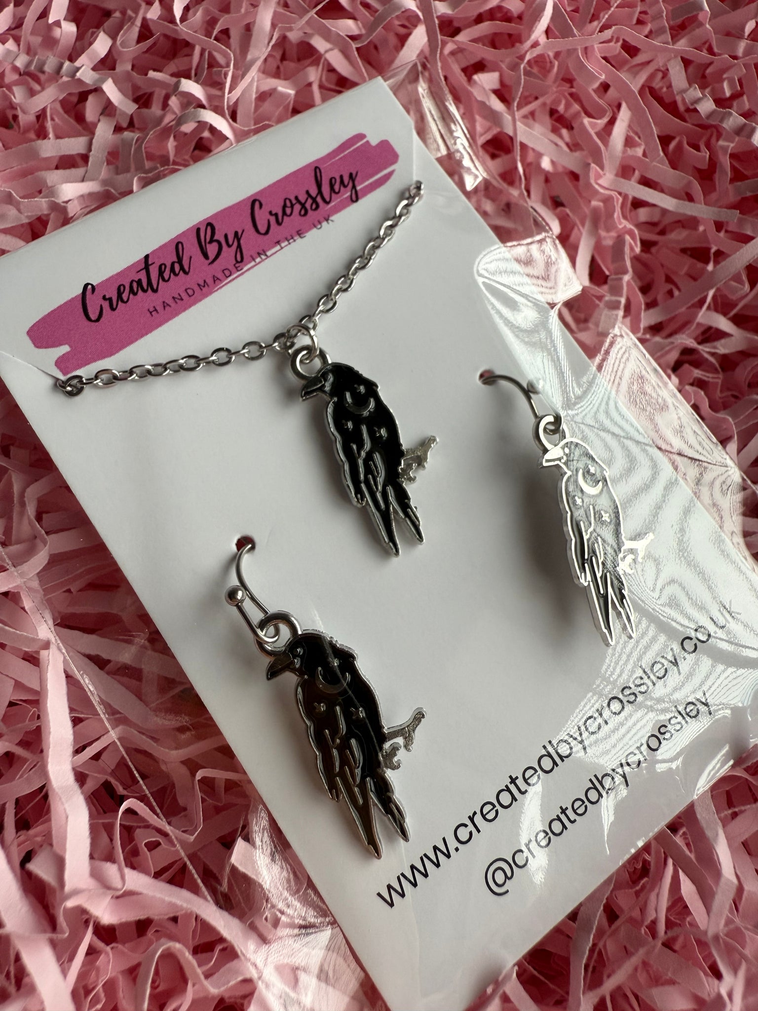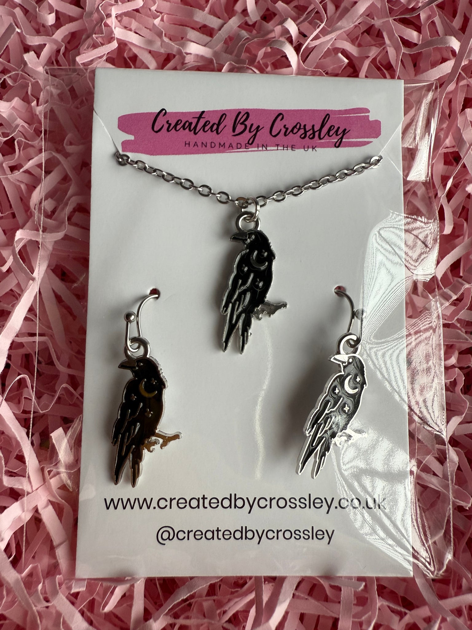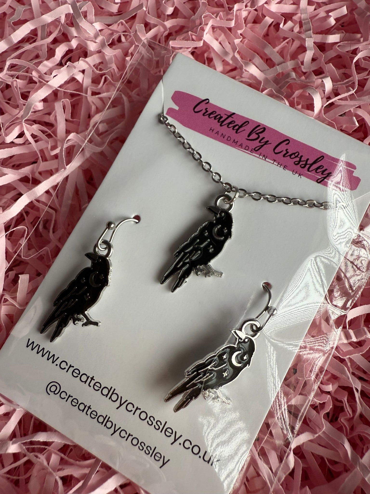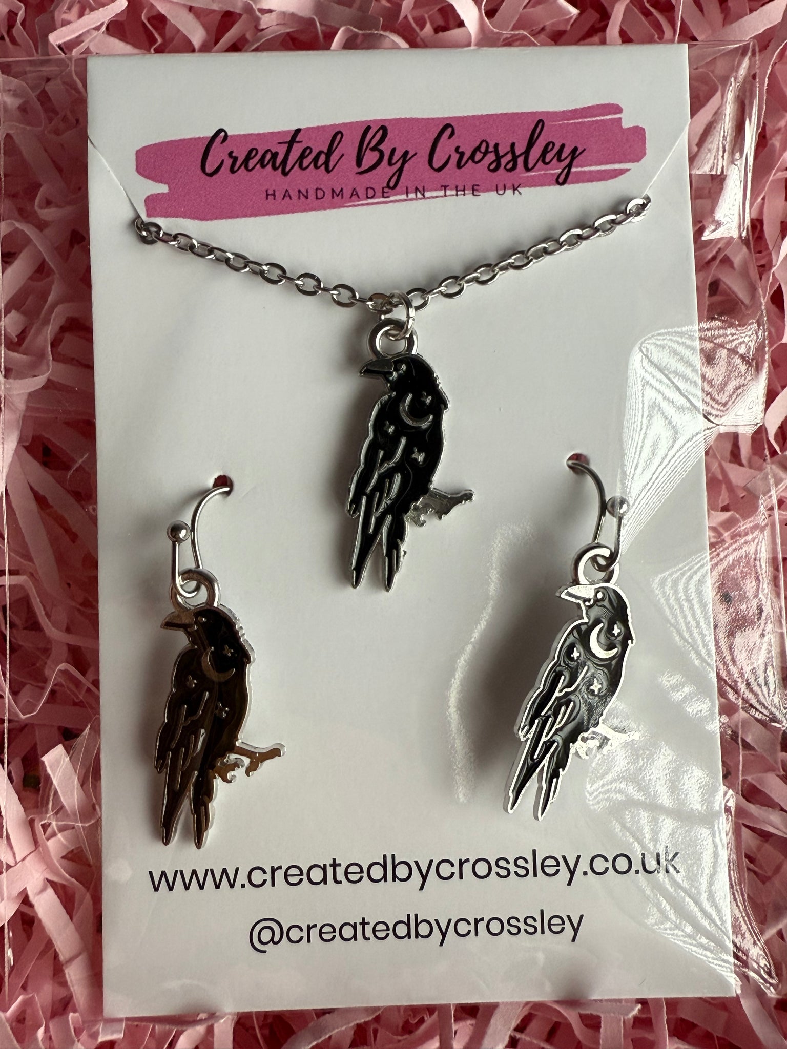 Matching black moon and star crow charm necklace and earrings with stainless steel hooks, perfect for gifting or accessorising your own outfits!