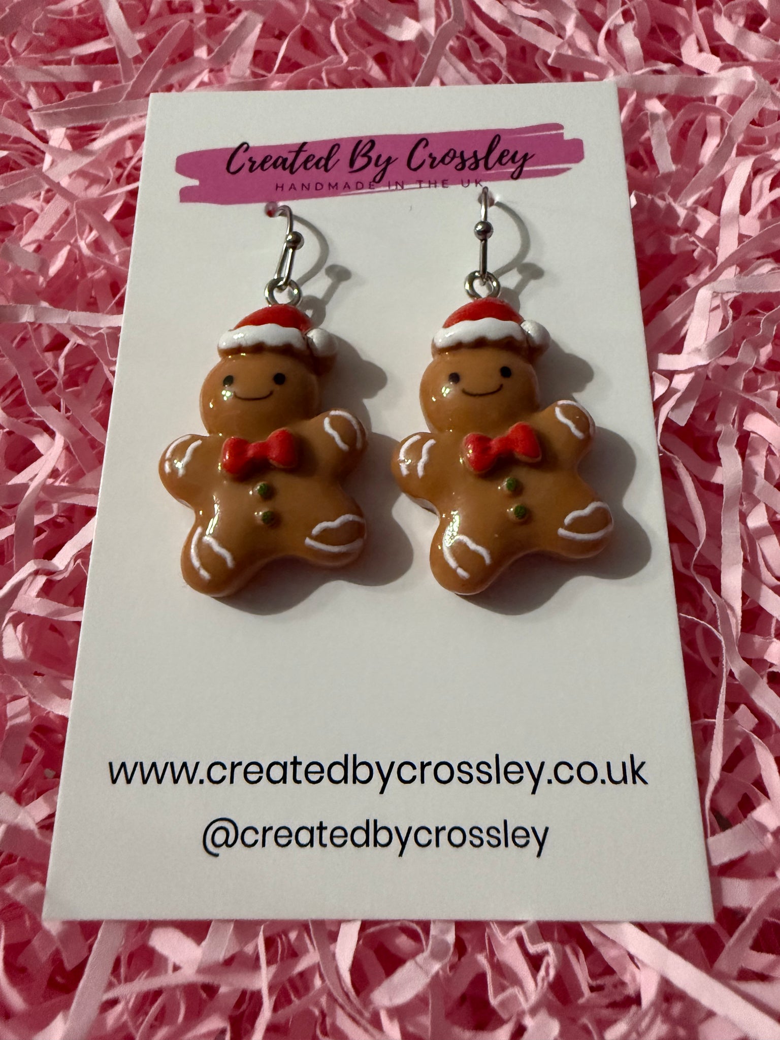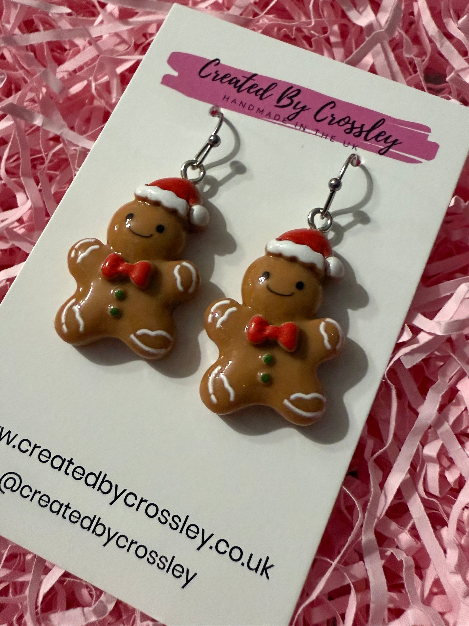 Adorable Santa hat wearing gingerbread men earrings, perfect for gifting or accessorising this festive season!