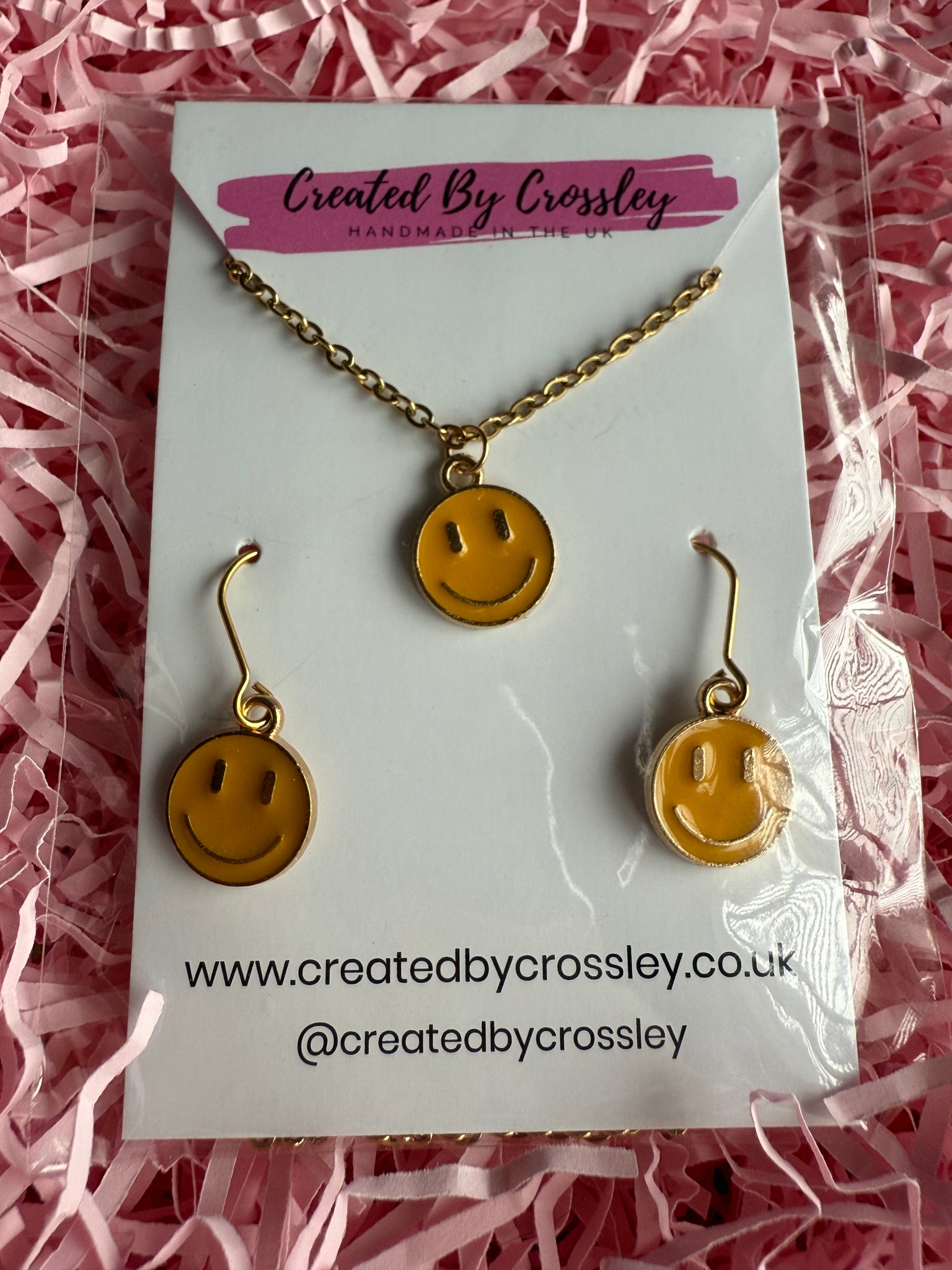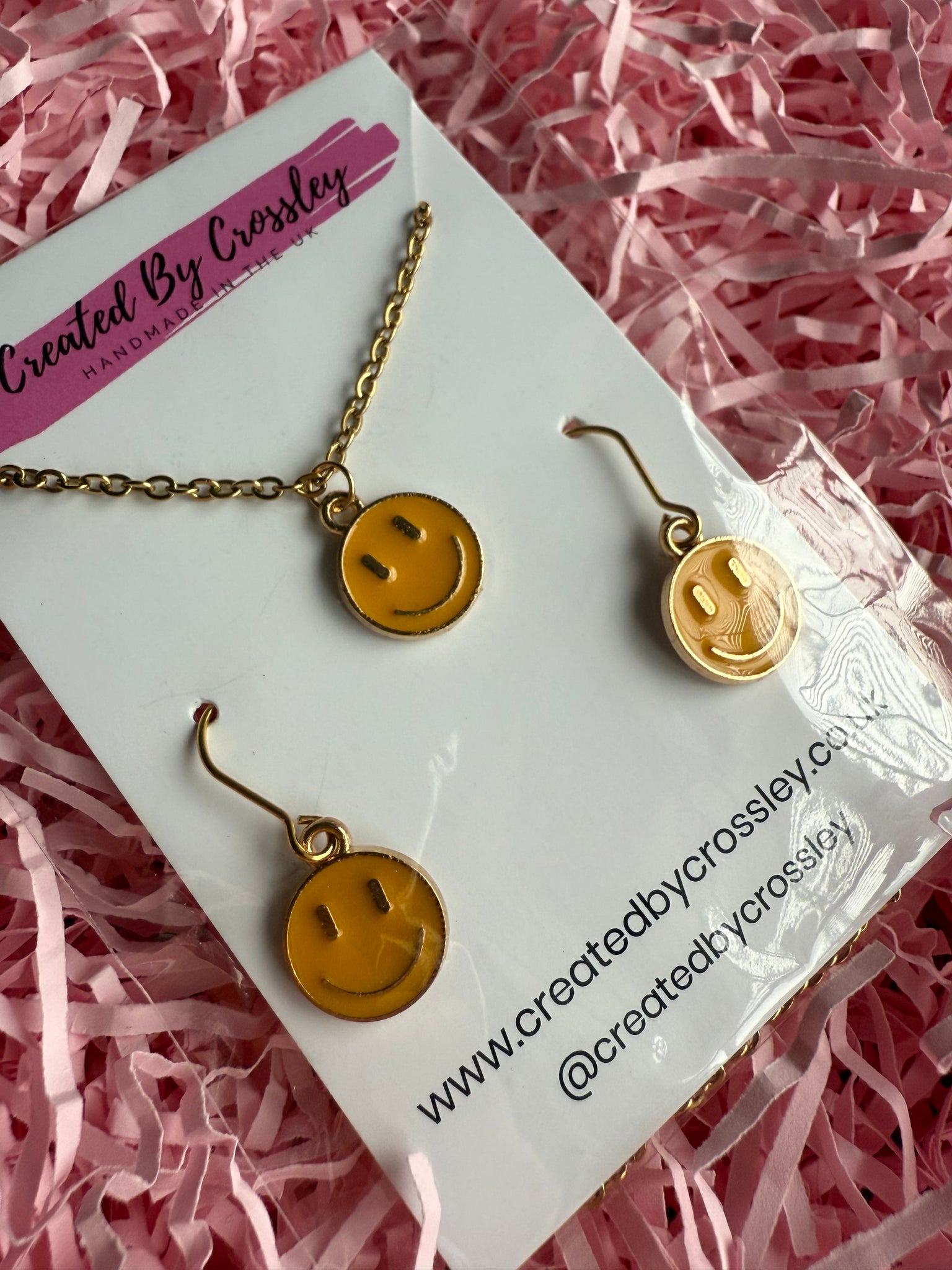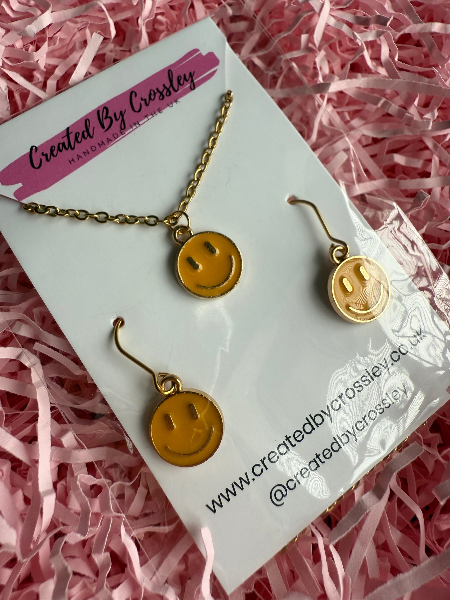 Cute matching happy face necklace and earrings with stainless steel hooks, perfect for gifting or accessorising your own outfits!