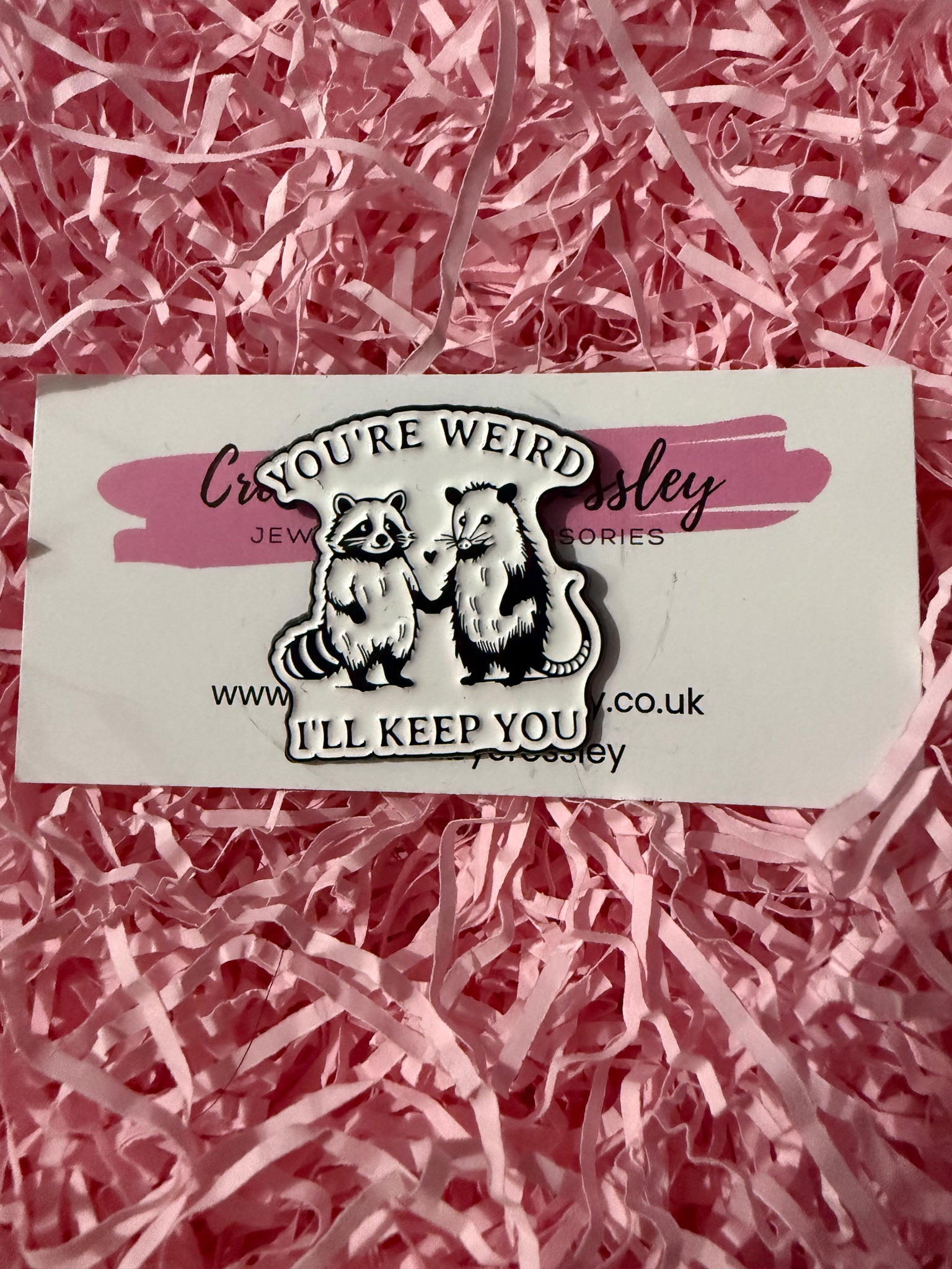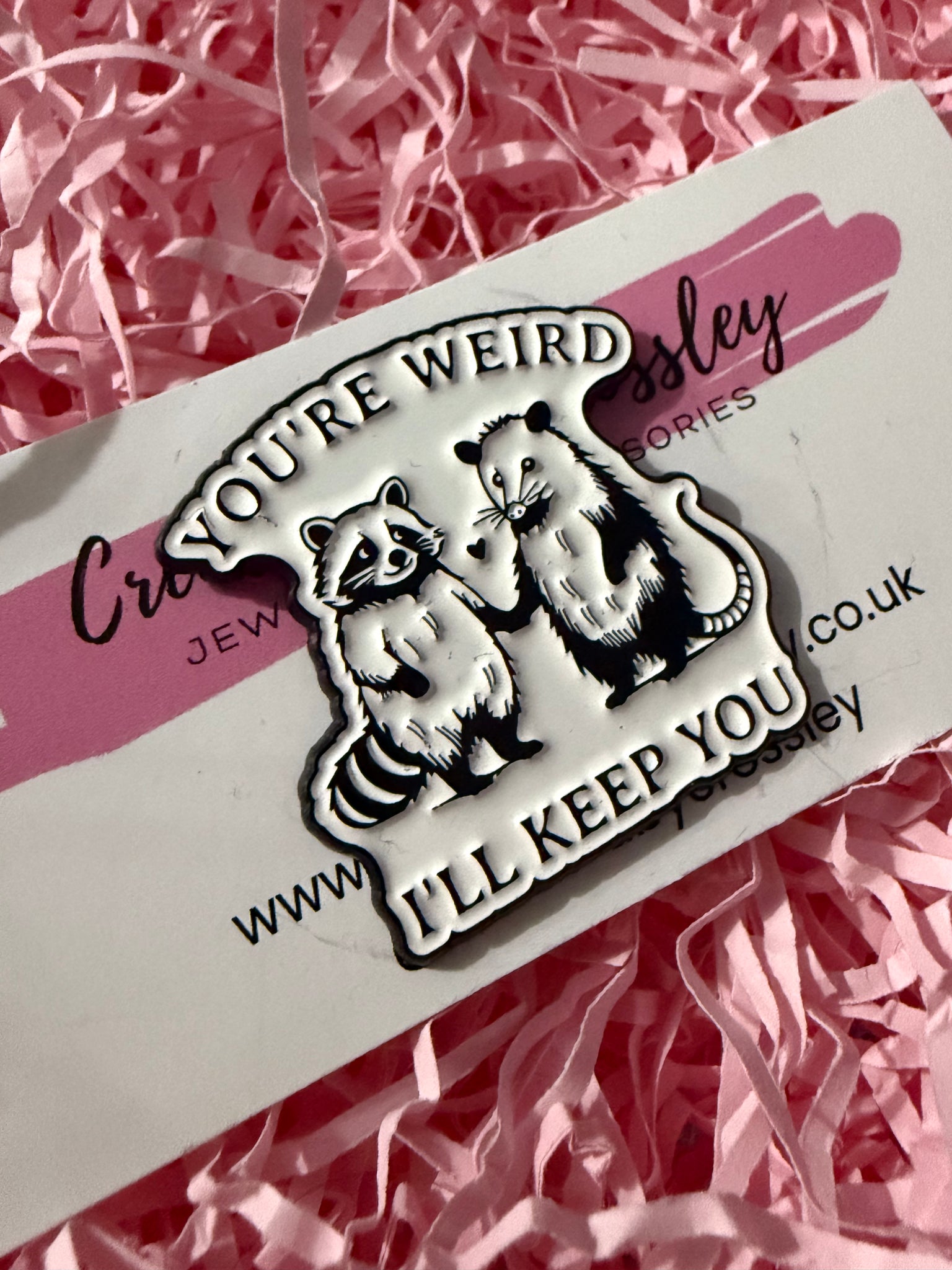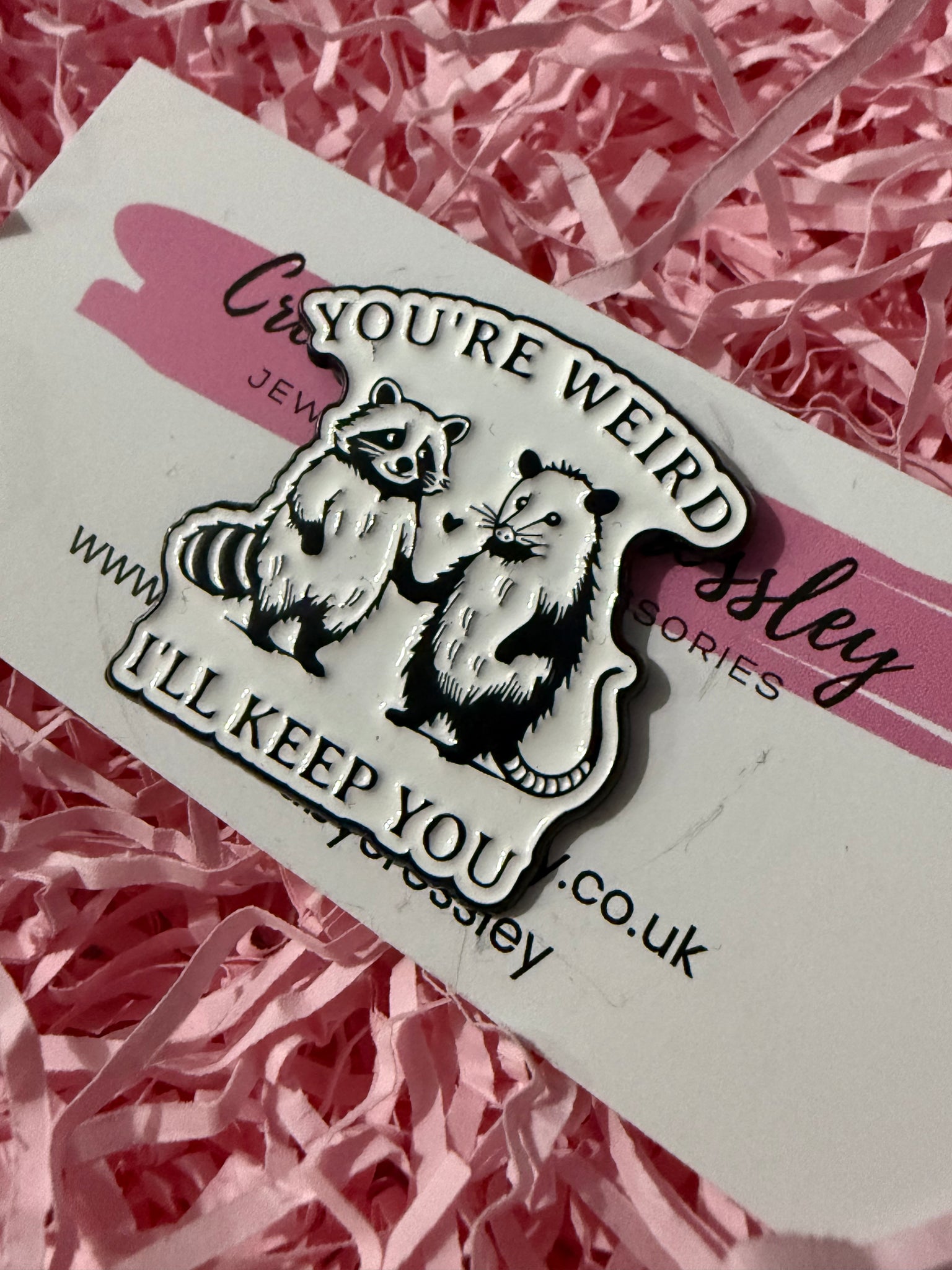 “You’re weird I’ll keep you” Raccoon and Possum Pin Badge