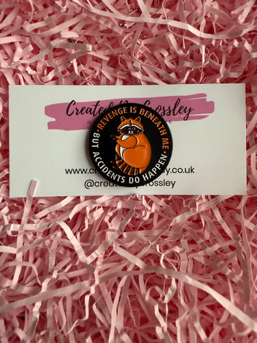 “Revenge is beneath me but accidents do happen” Raccoon Pin Badge