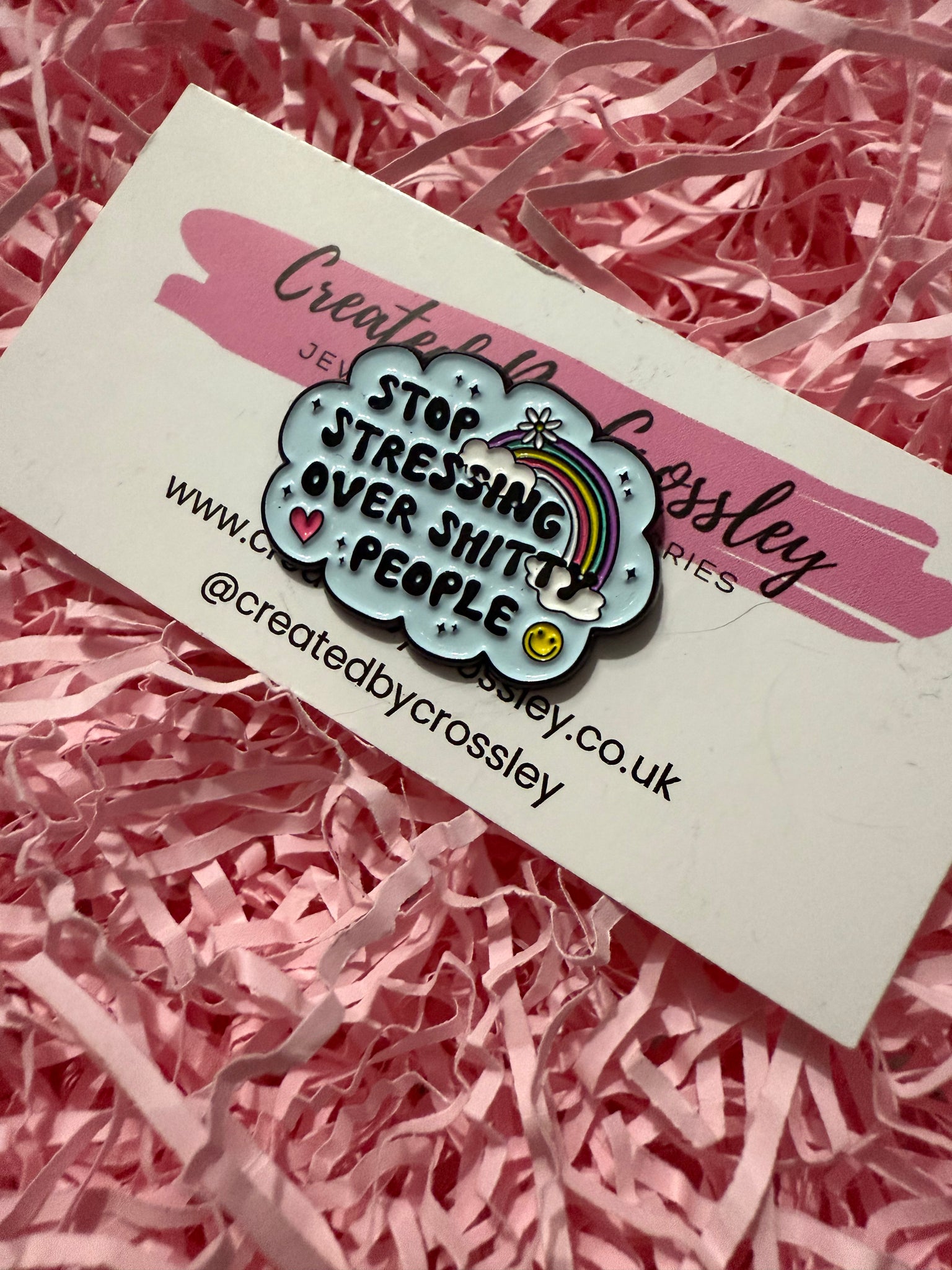 “Stop stressing over shitty people” rainbow cloud pin badge.