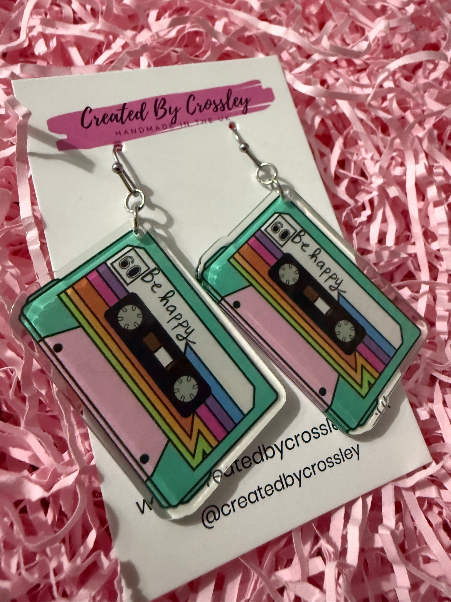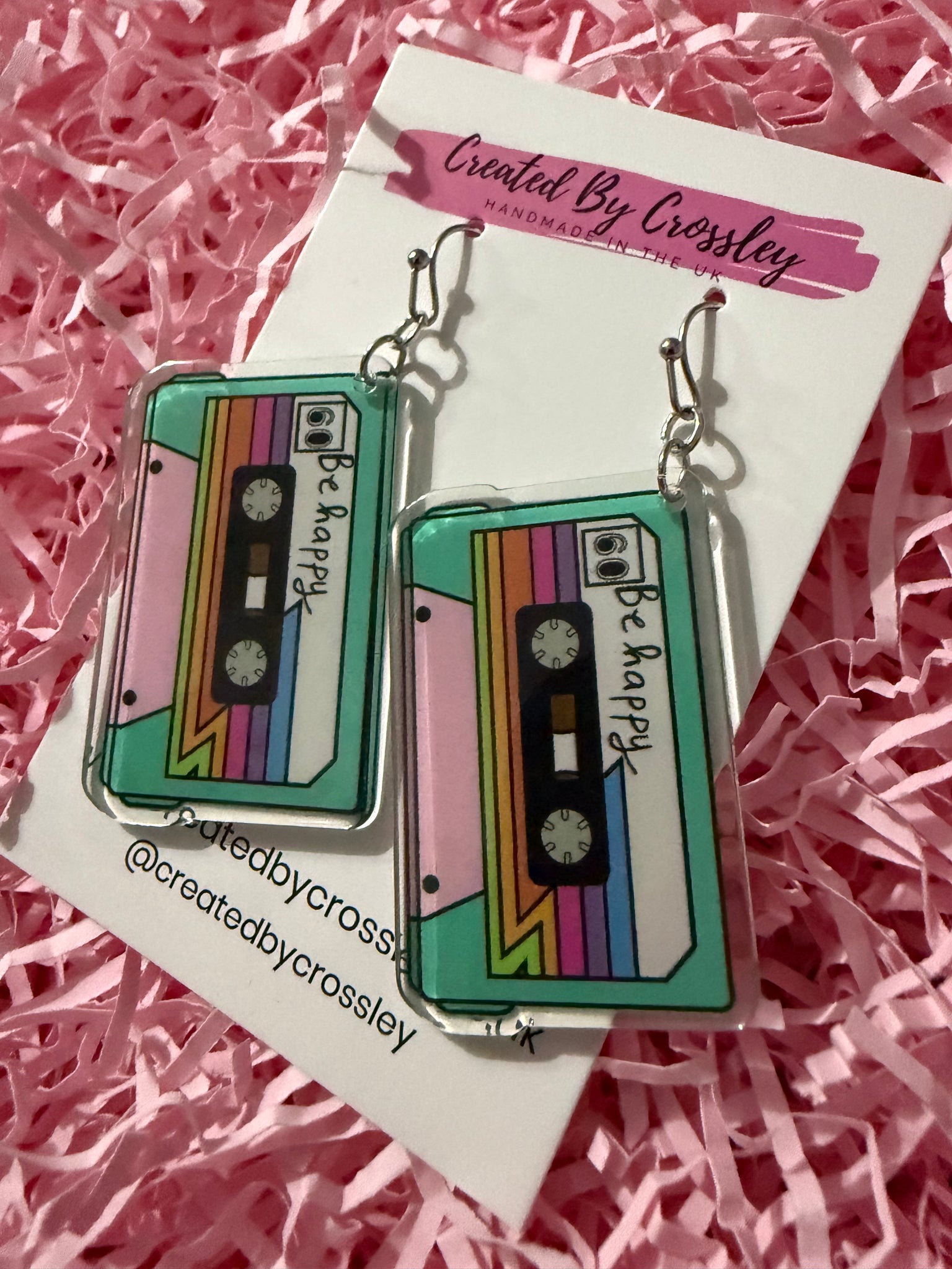 Large cassette “be happy” earrings perfect for music lovers! Stainless steel hooks