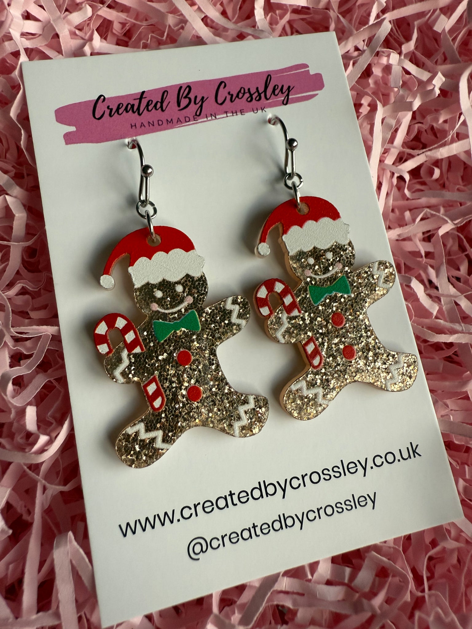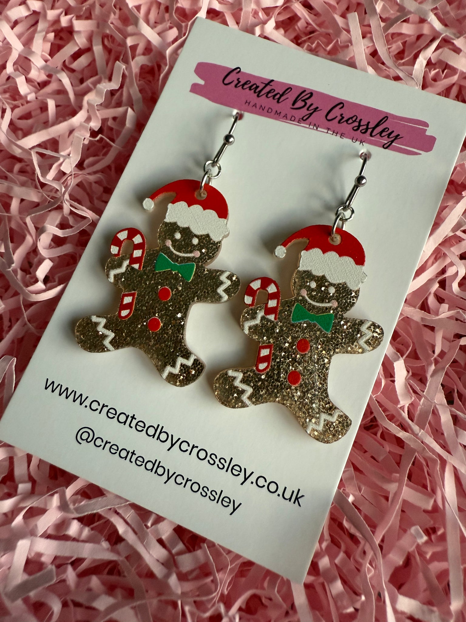 Super glittery gingerbread man earrings perfect for adding some sparkle and fun to your festive outfits! Stainless steel hooks