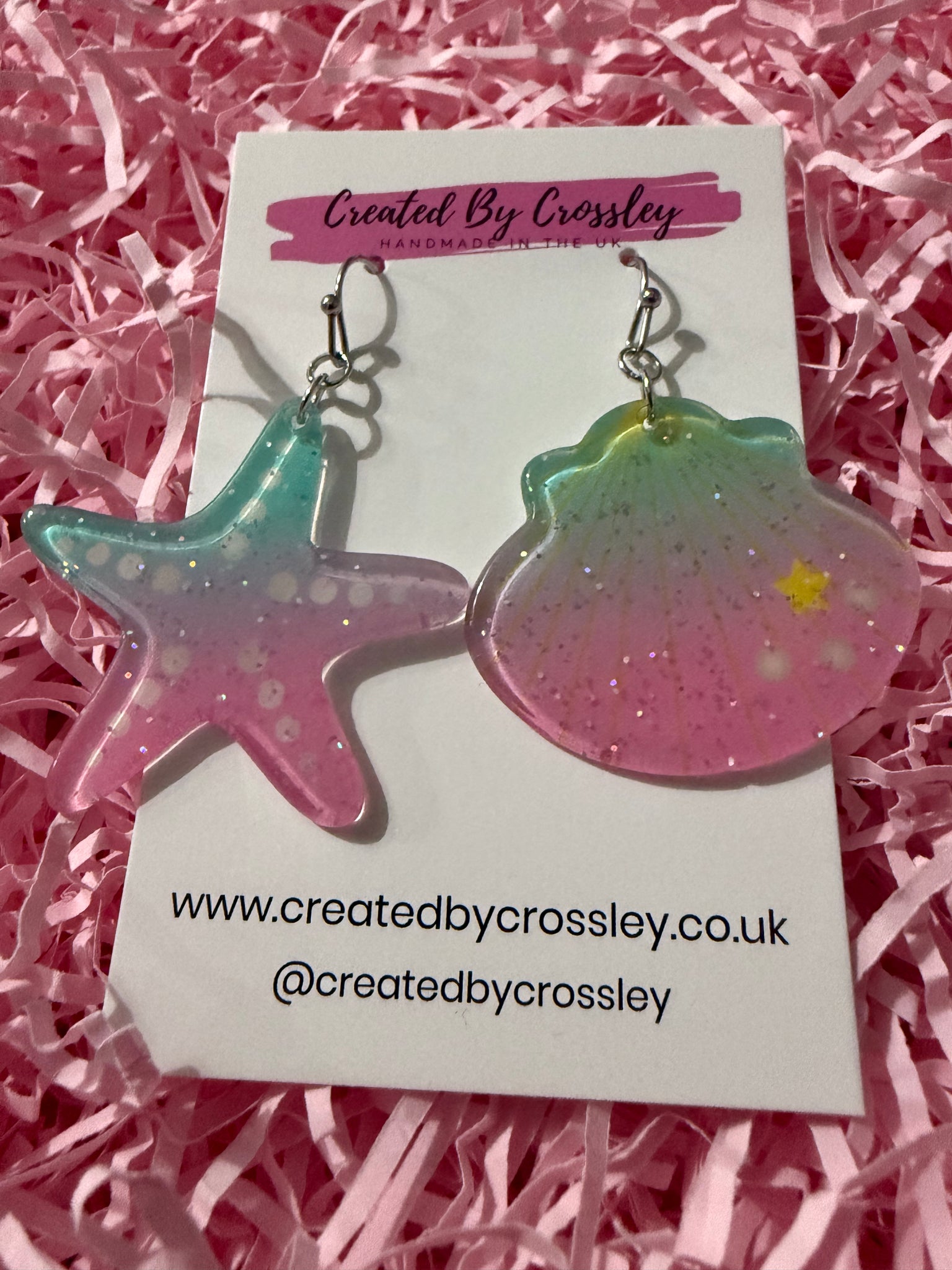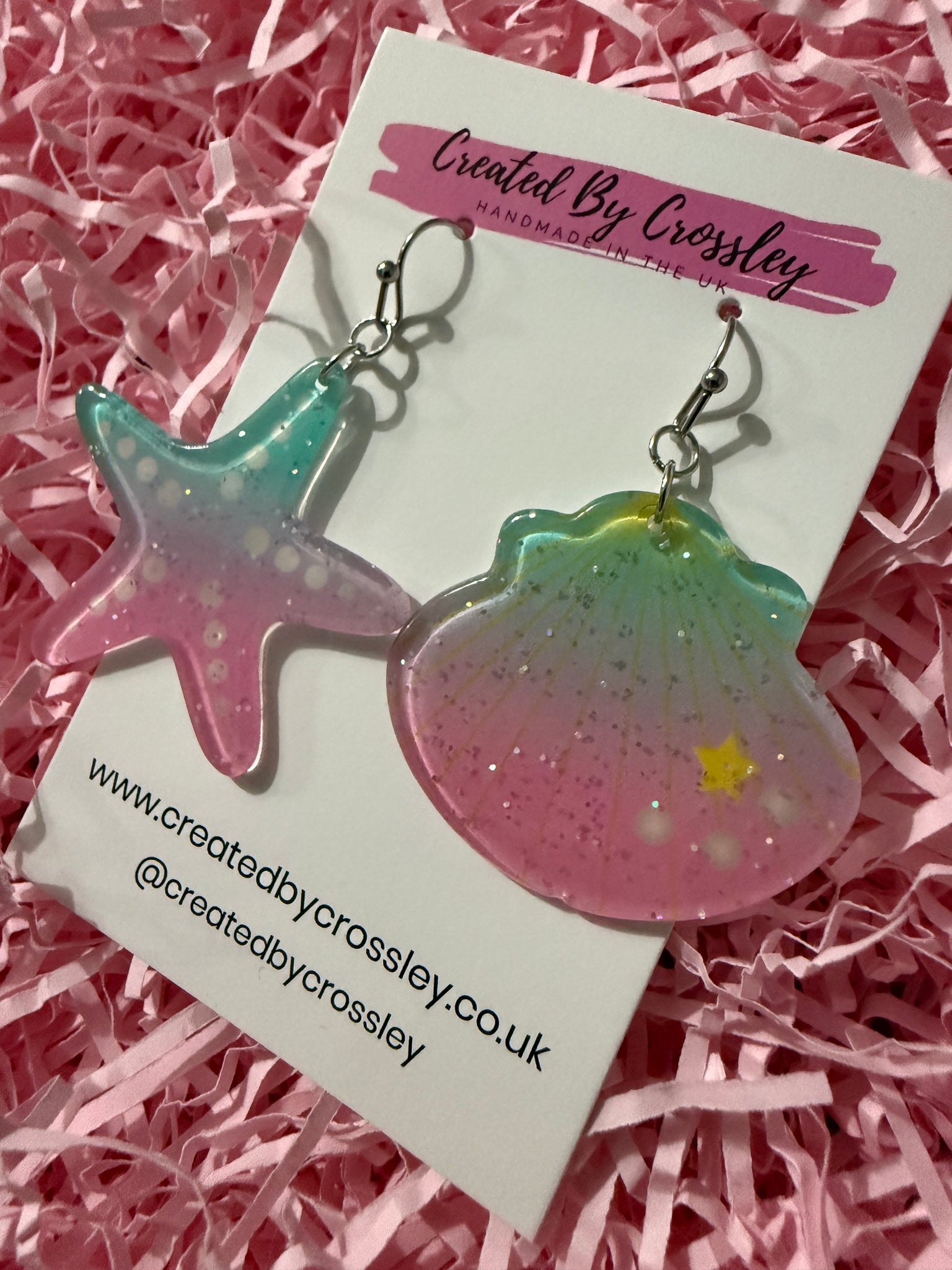 Large statement earrings with glittery pink and blue seashell and starfish, perfect as holiday earrings or for beach lovers! Stainless steel hooks