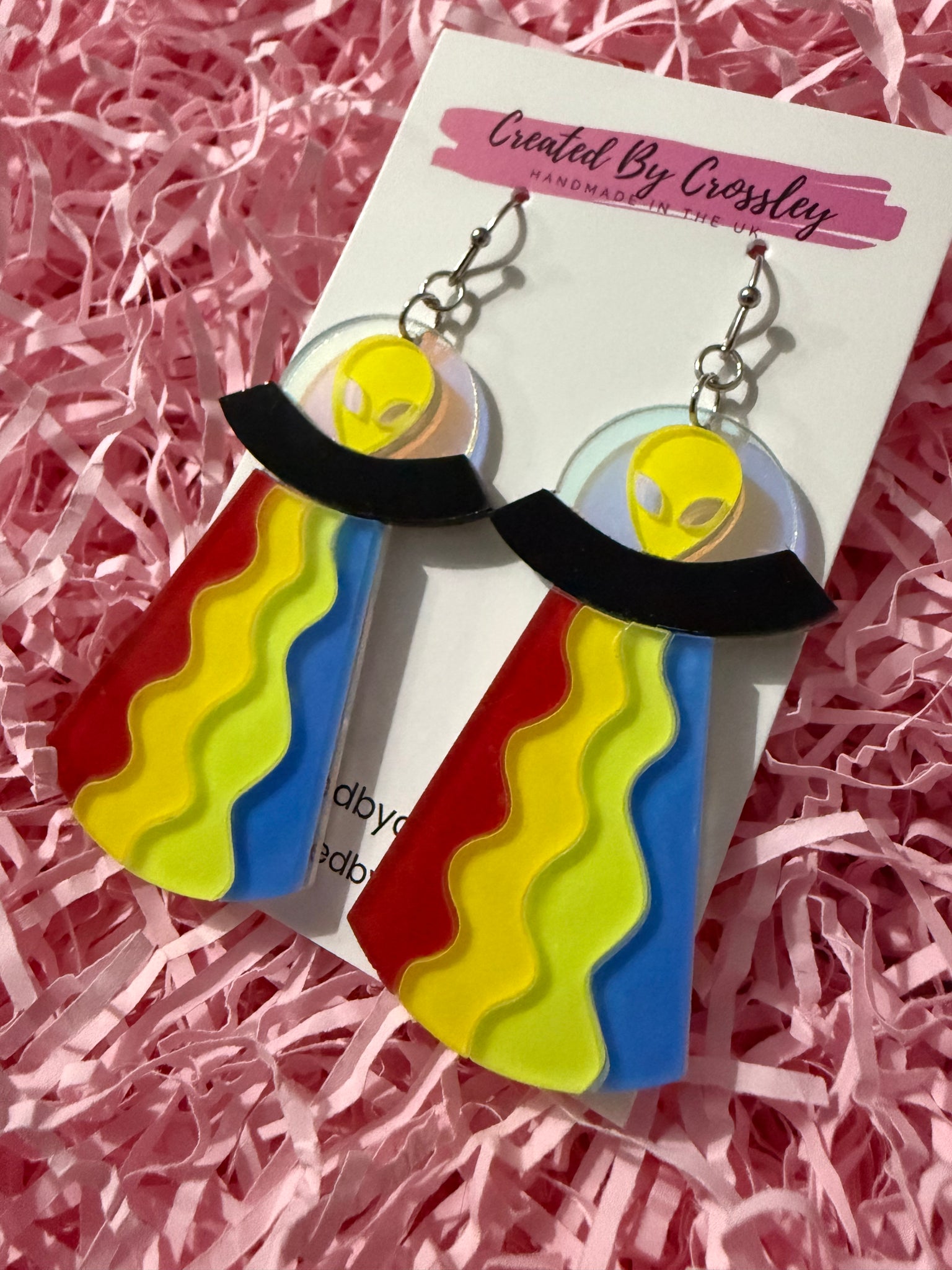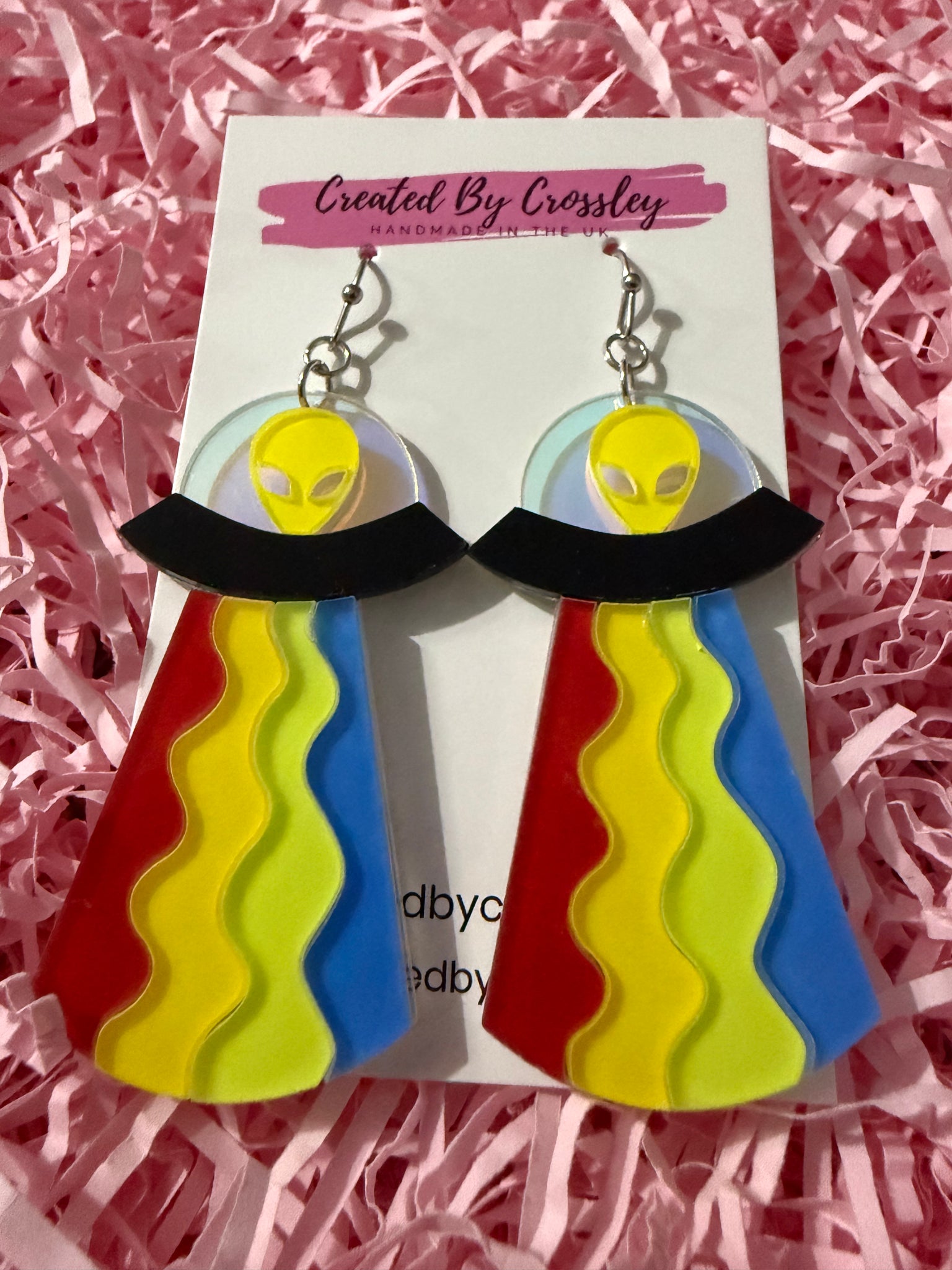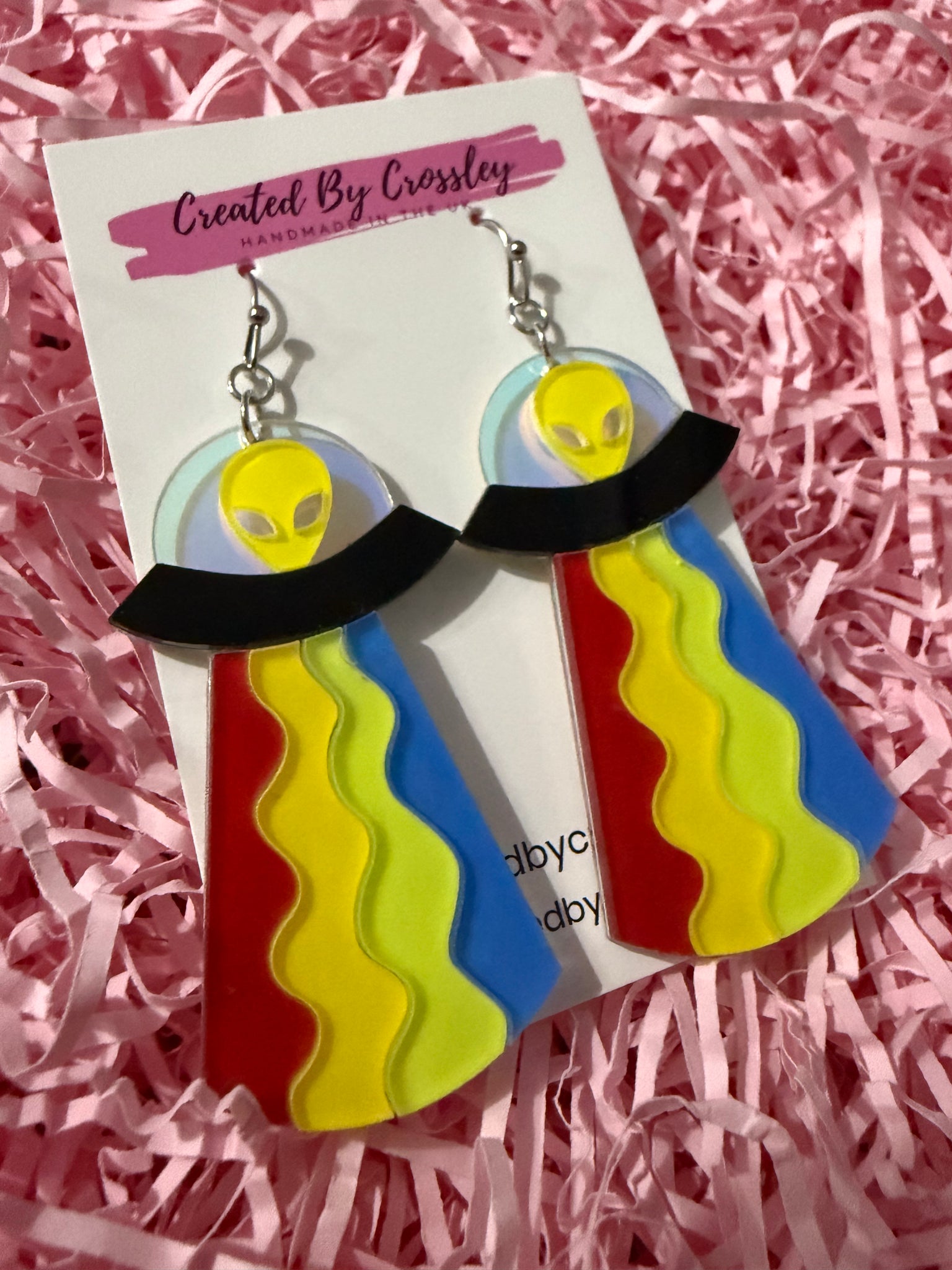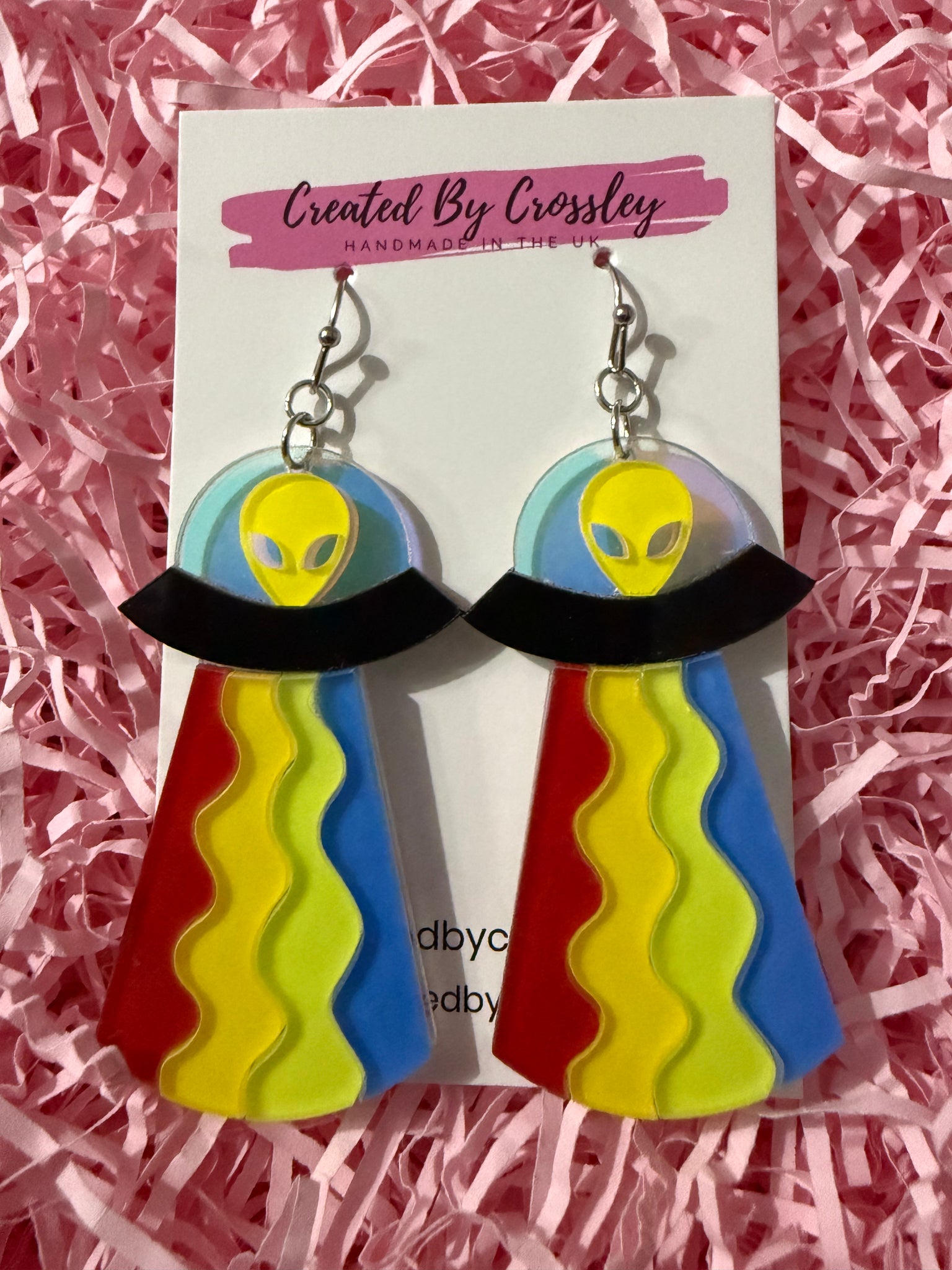 Bright and colourful alien abduction earrings, perfect for adding a fun statement to your outfit! Stainless steel hooks