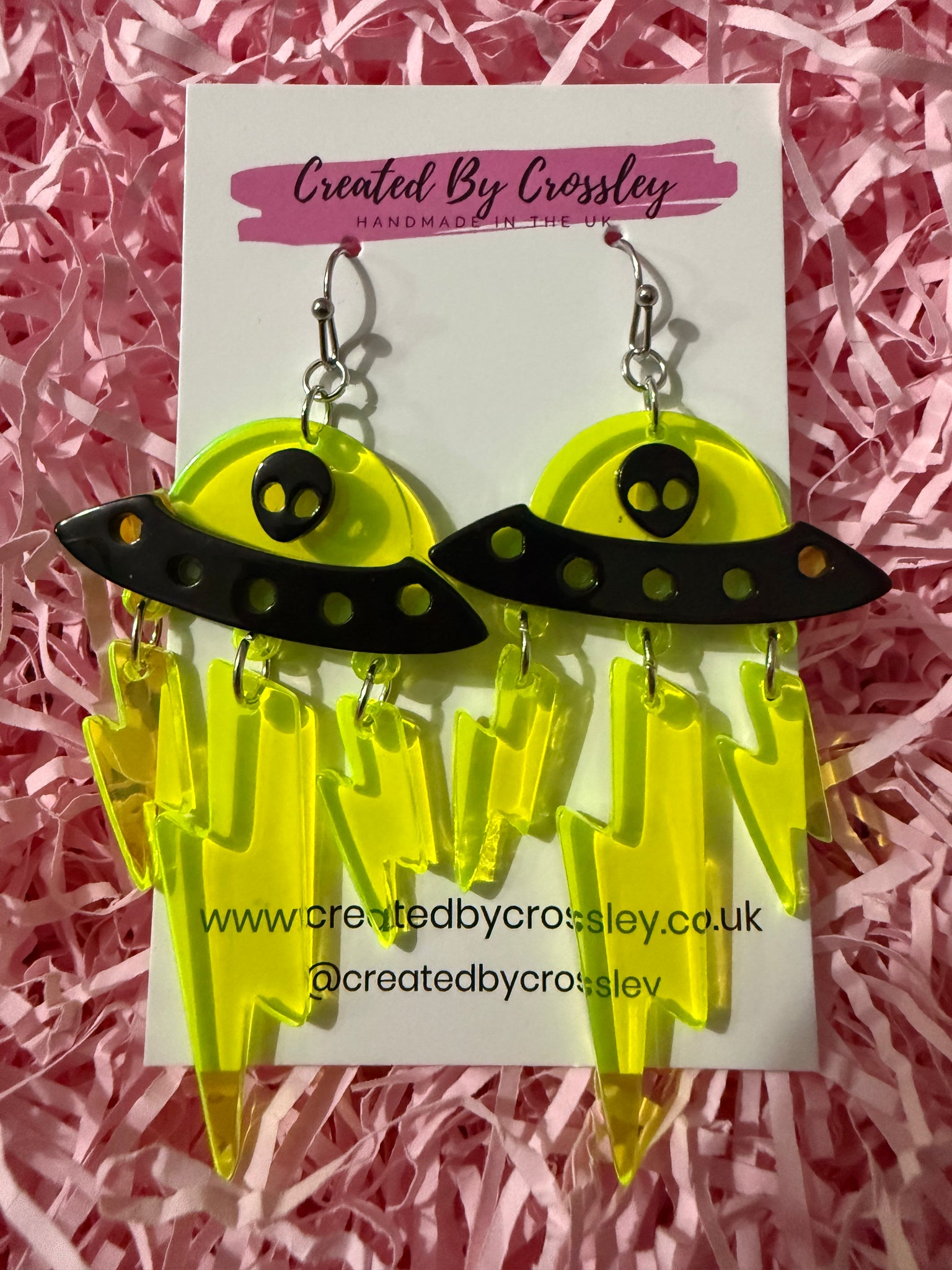 Neon yellow alien lightning earrings, great for adding some colour and fun to your outfit! Stainless steel hooks