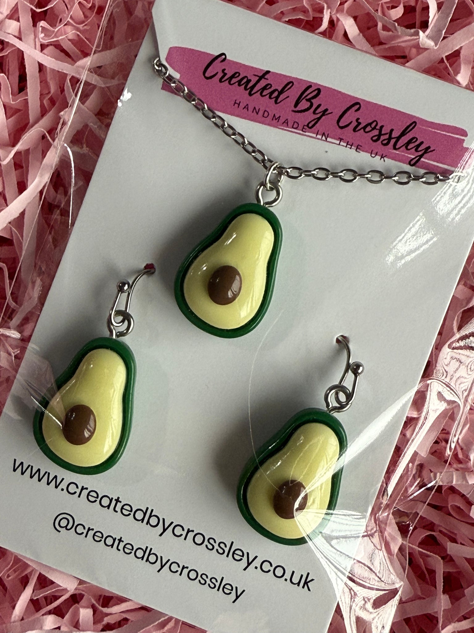 Matching avocado charm necklace and earrings with stainless steel hooks, perfect for gifting or adding some colour and fun to your own outfits!