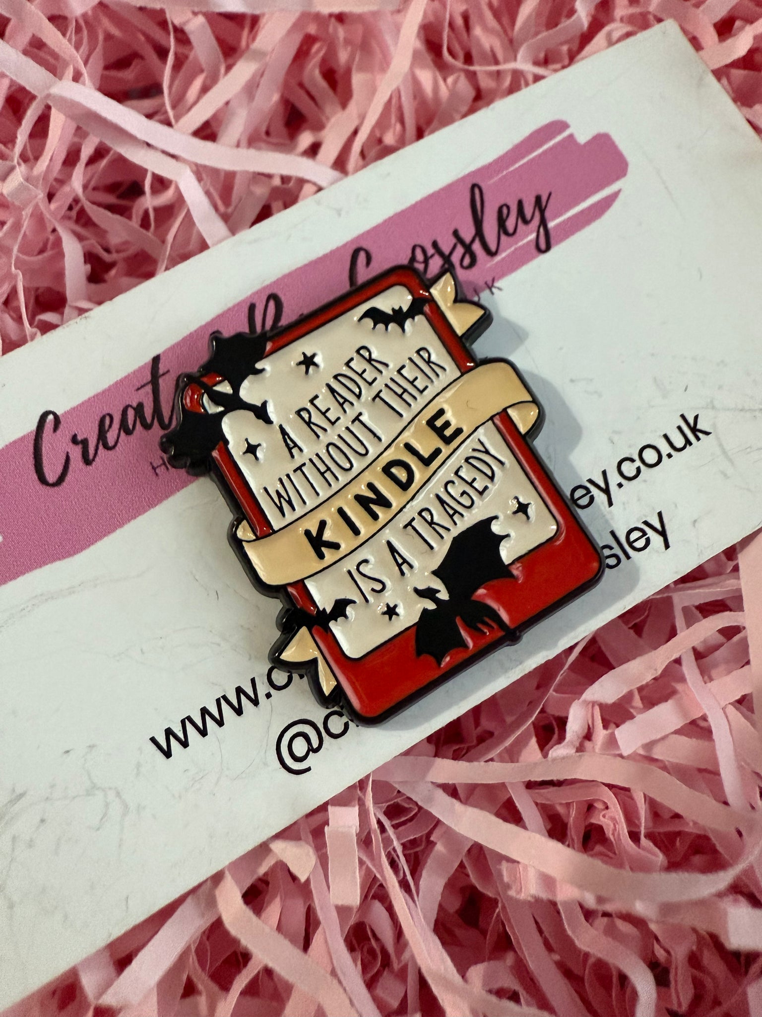 “A reader without their kindle is a tragedy” fantasy dragon kindle pin badge. Pin badges can be used on bags, clothing, pencil cases, lanyards and more, to accessorise and add some colour and personality to your items.
