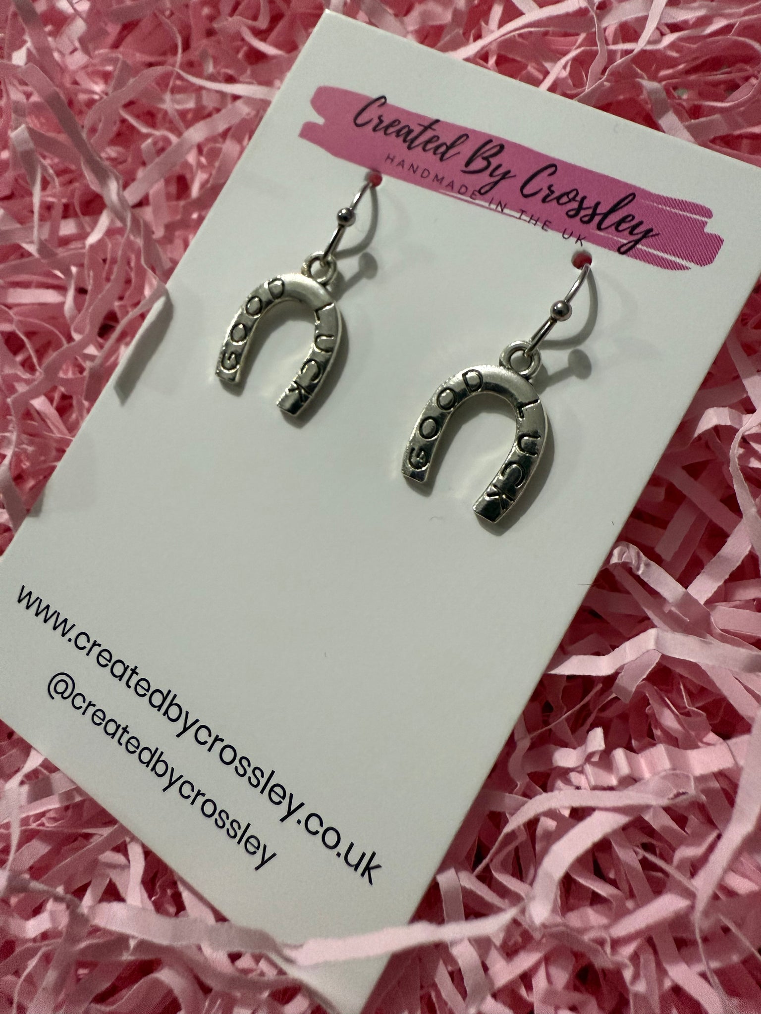 Horseshoe shaped earrings with “good luck” wording, perfect for gifting!