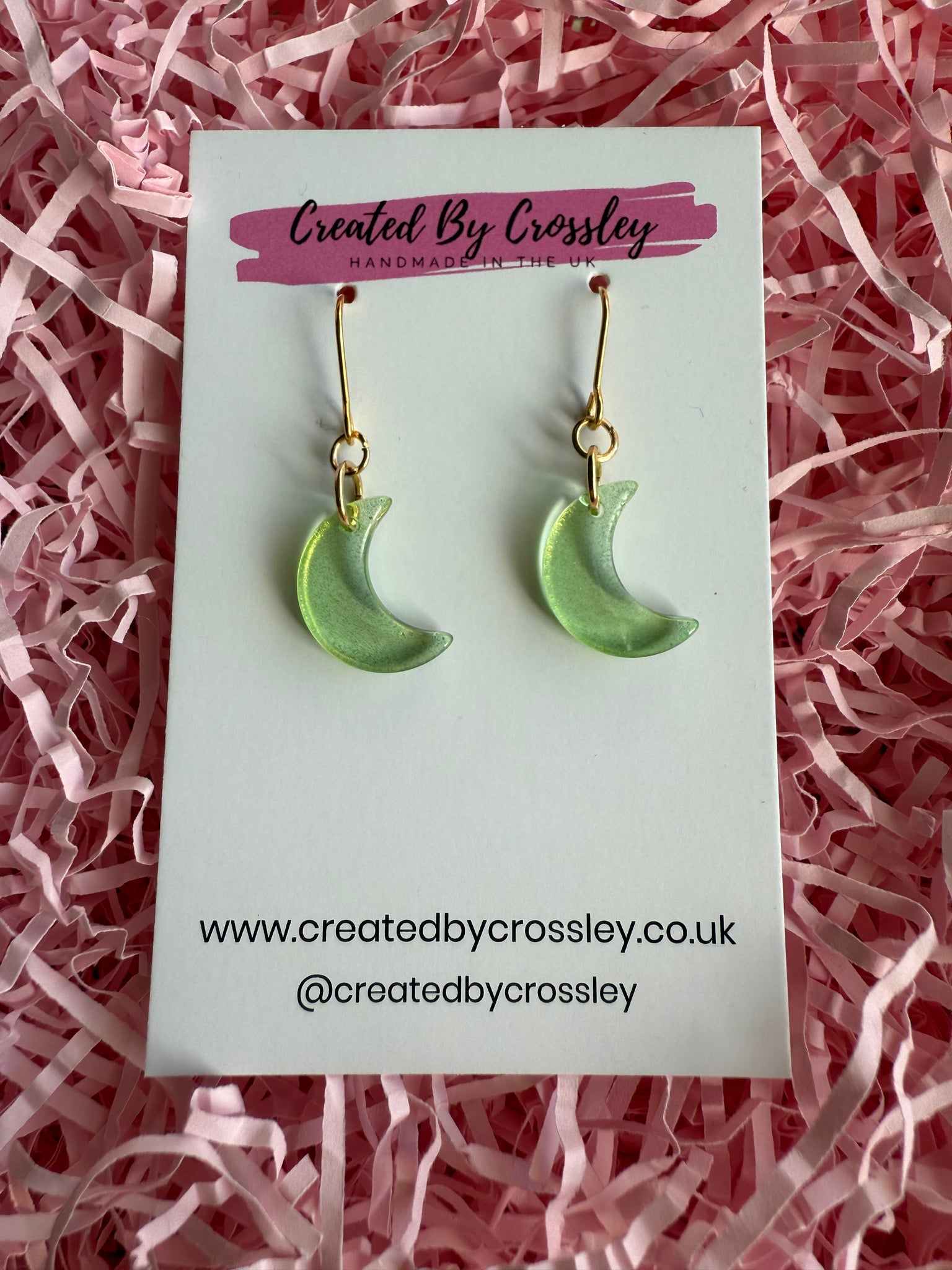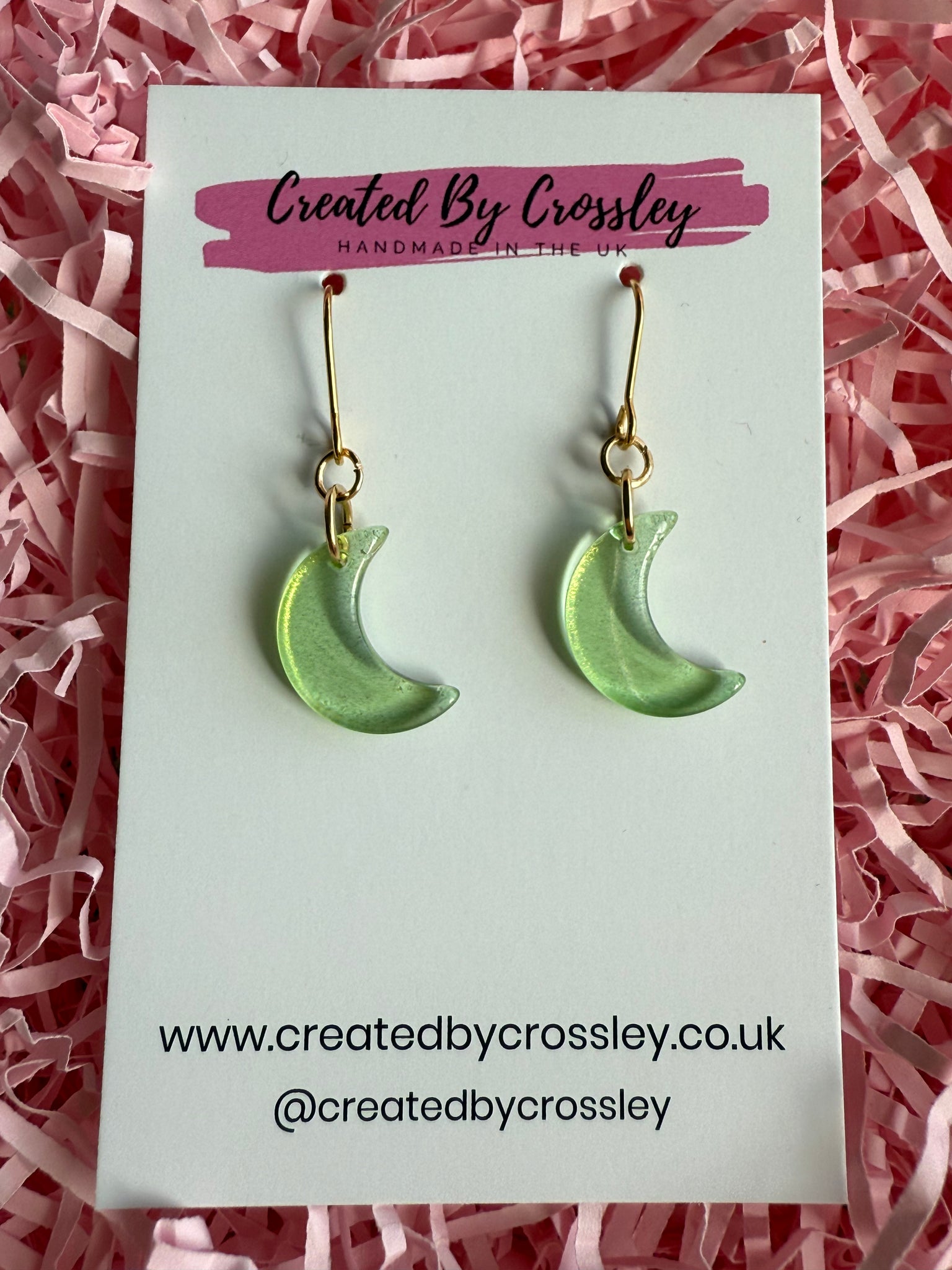 Green moon earrings, great for gifting or adding some colour and fun to your own outfits! Stainless steel hooks