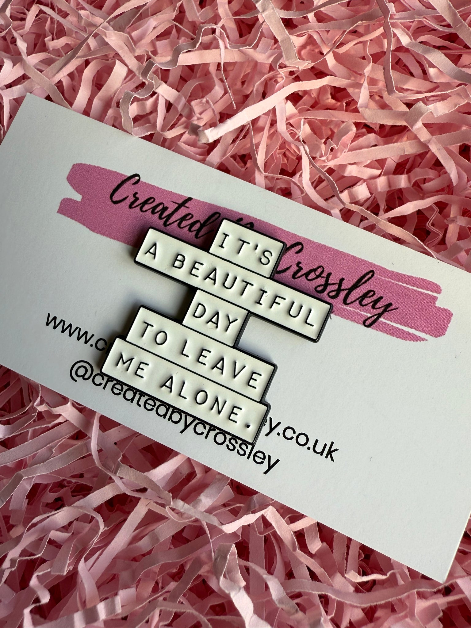 “It’s a beautiful day to leave me alone.” Pin Badge. Pin badges can be used on bags, clothing, pencil cases, lanyards and more, to accessorise and add some colour and personality to your items.