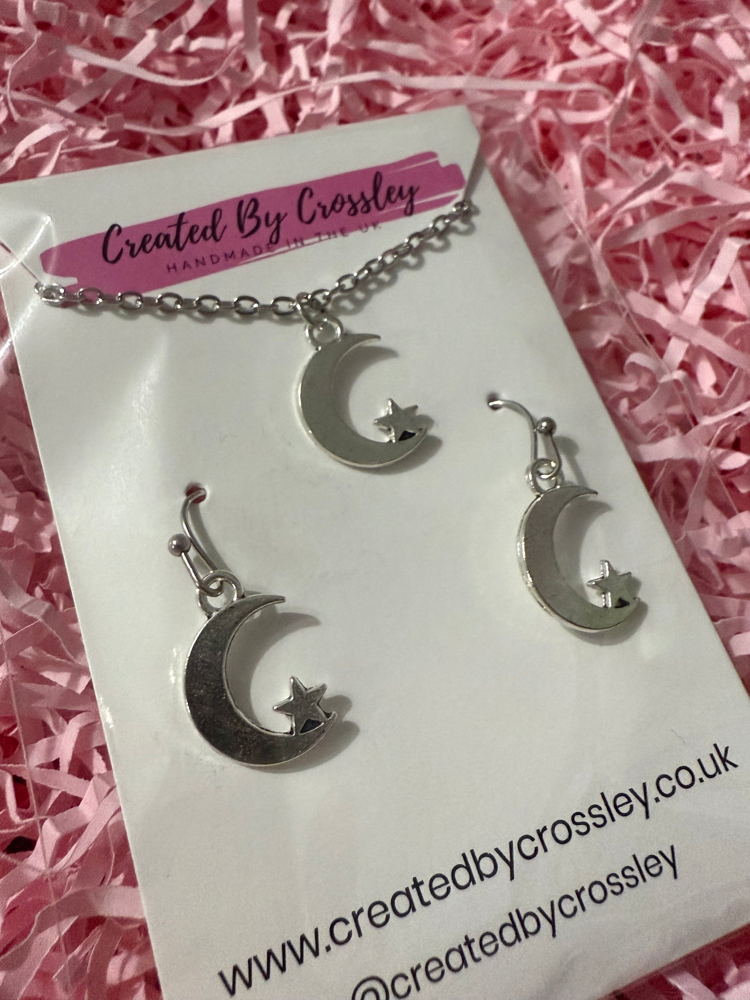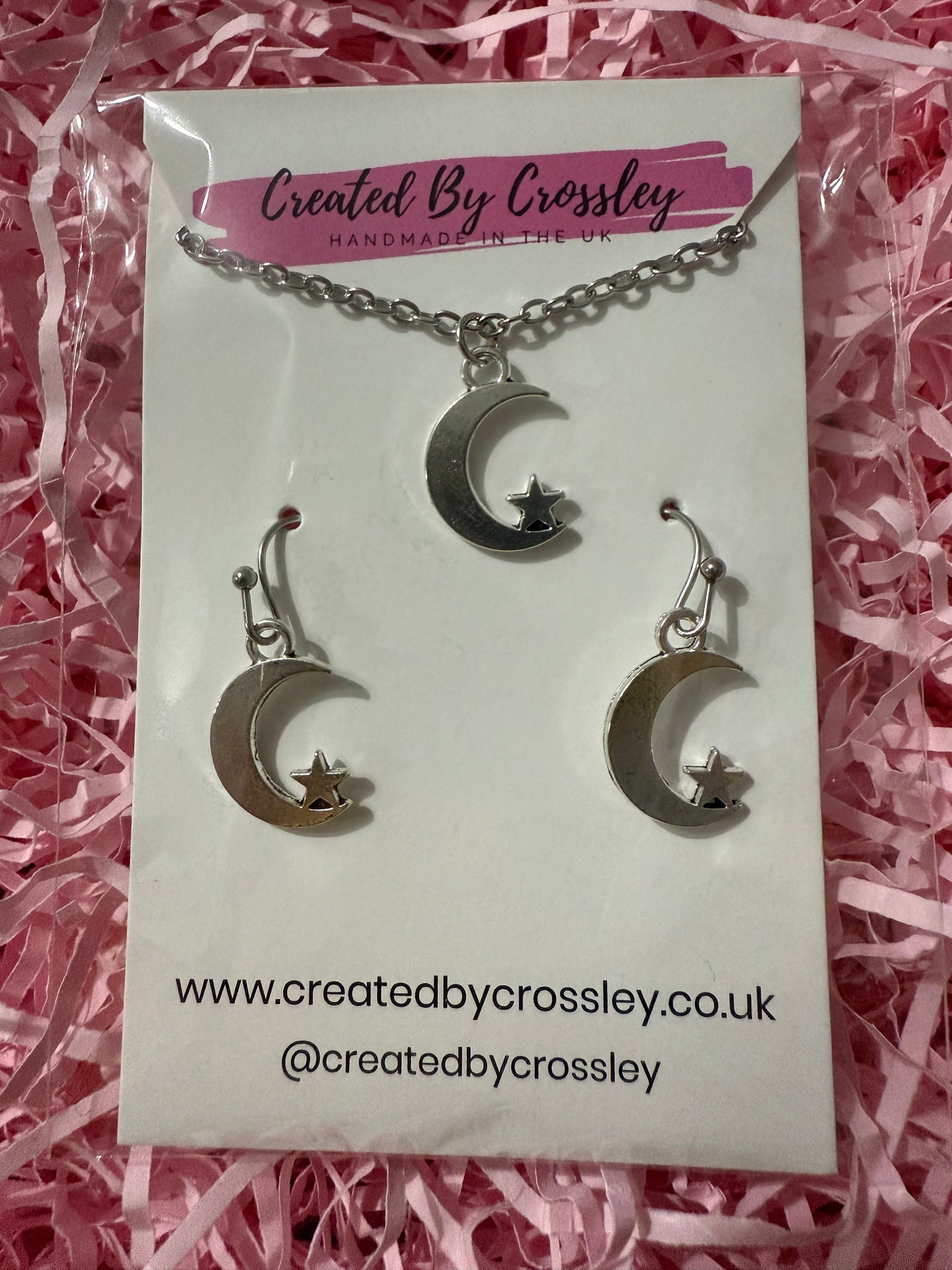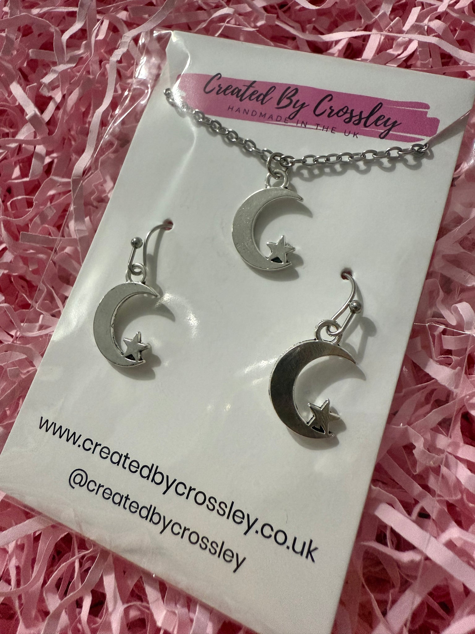 Matching moon and star charm necklace and earrings with stainless steel hooks. Perfect for gifting or adding to your own outfits!