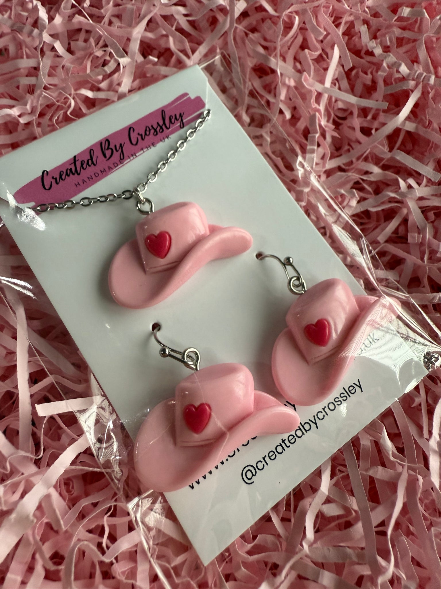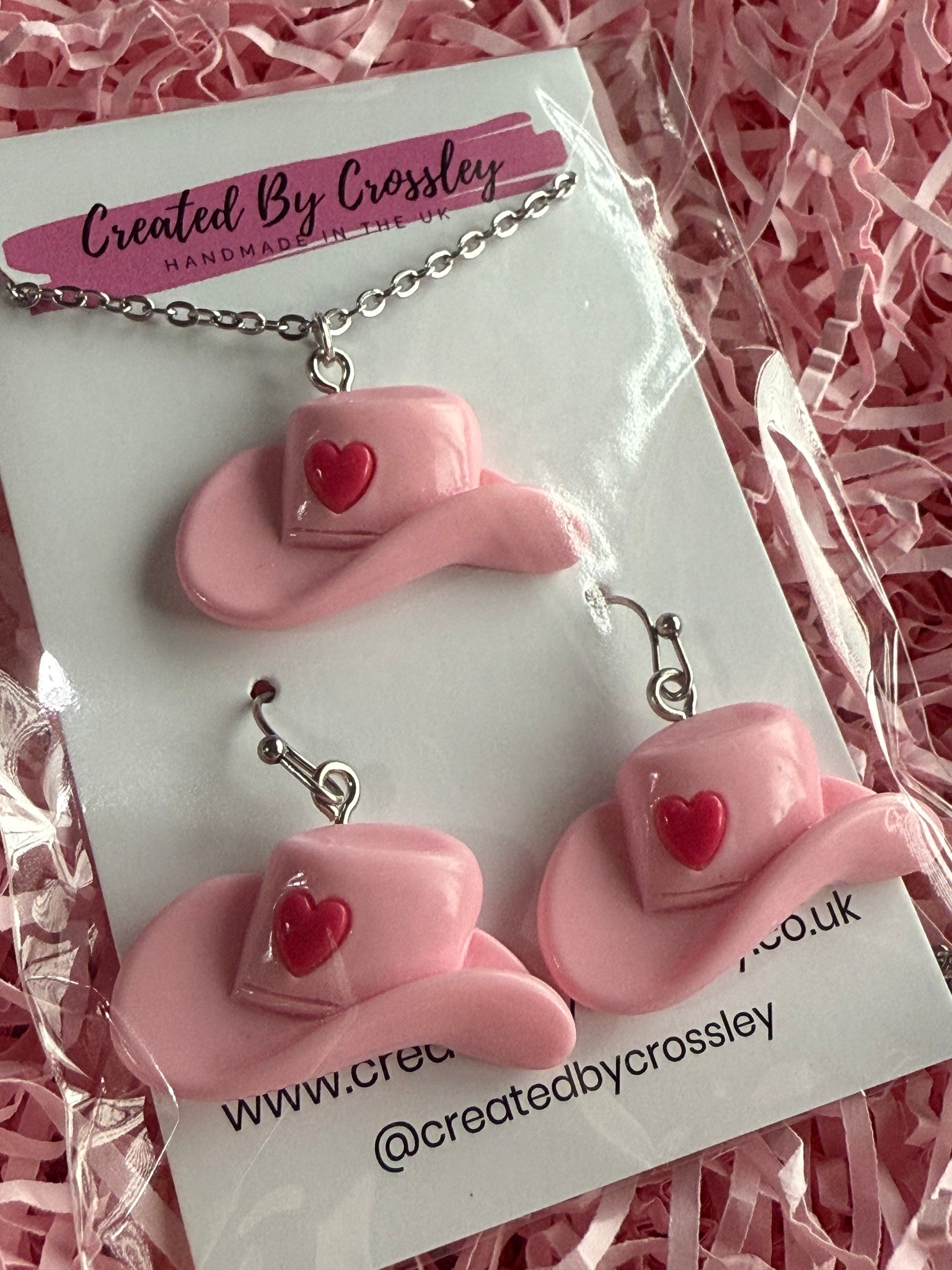 Cute matching pink cowboy hat charm necklace and earrings with stainless steel hooks, great for gifting or adding some colour and fun to your own outfits!