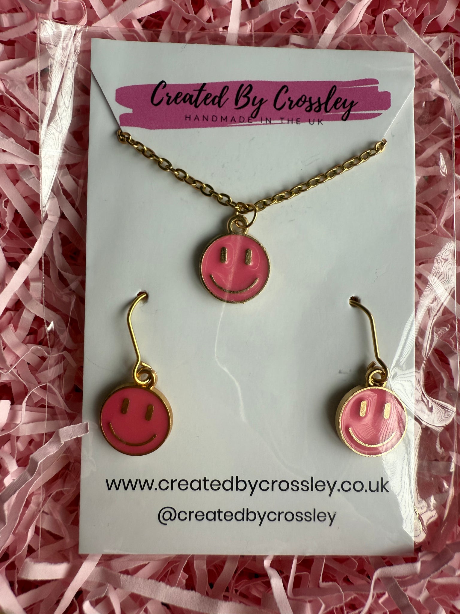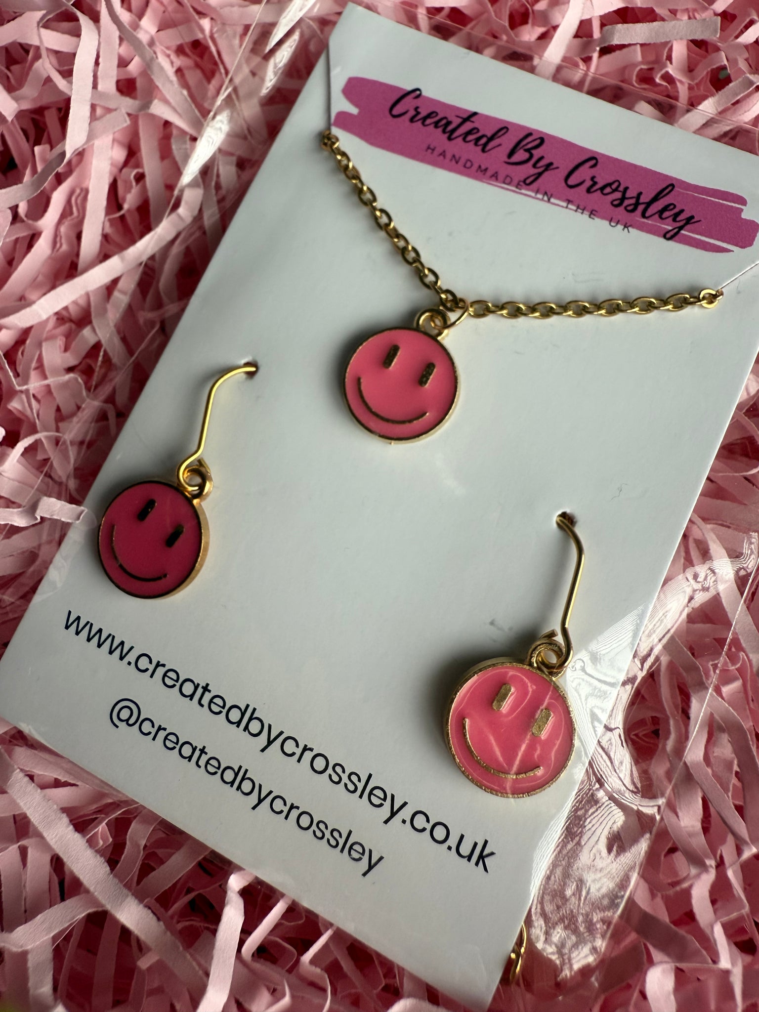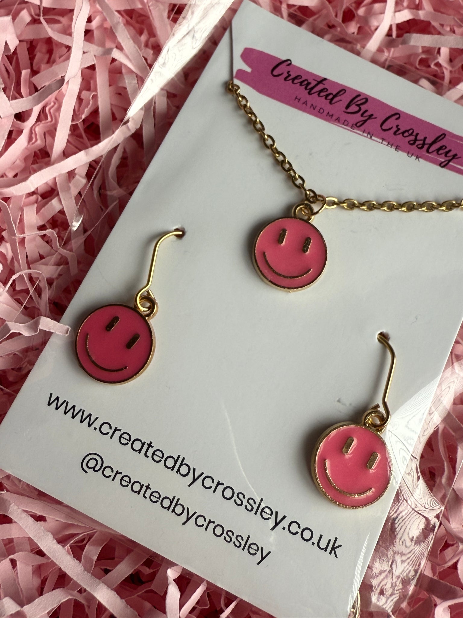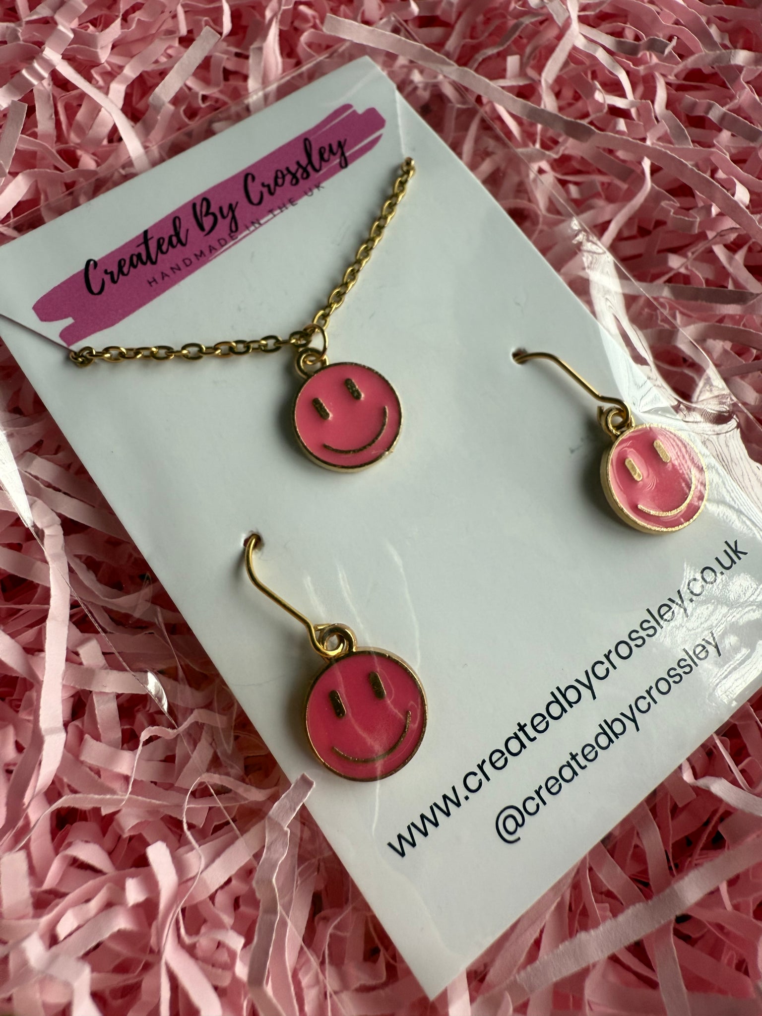Cute matching happy face necklace and earrings with stainless steel hooks, perfect for gifting or accessorising your own outfits!