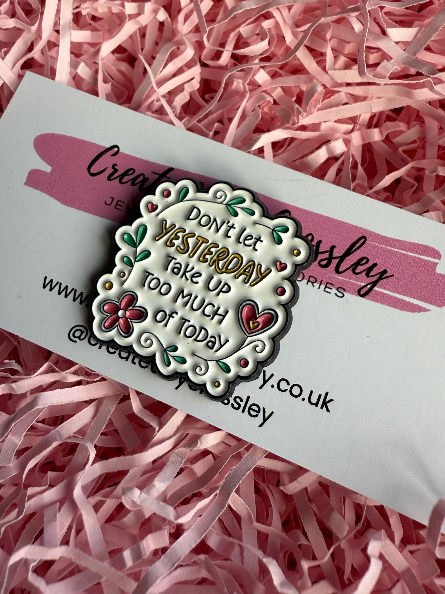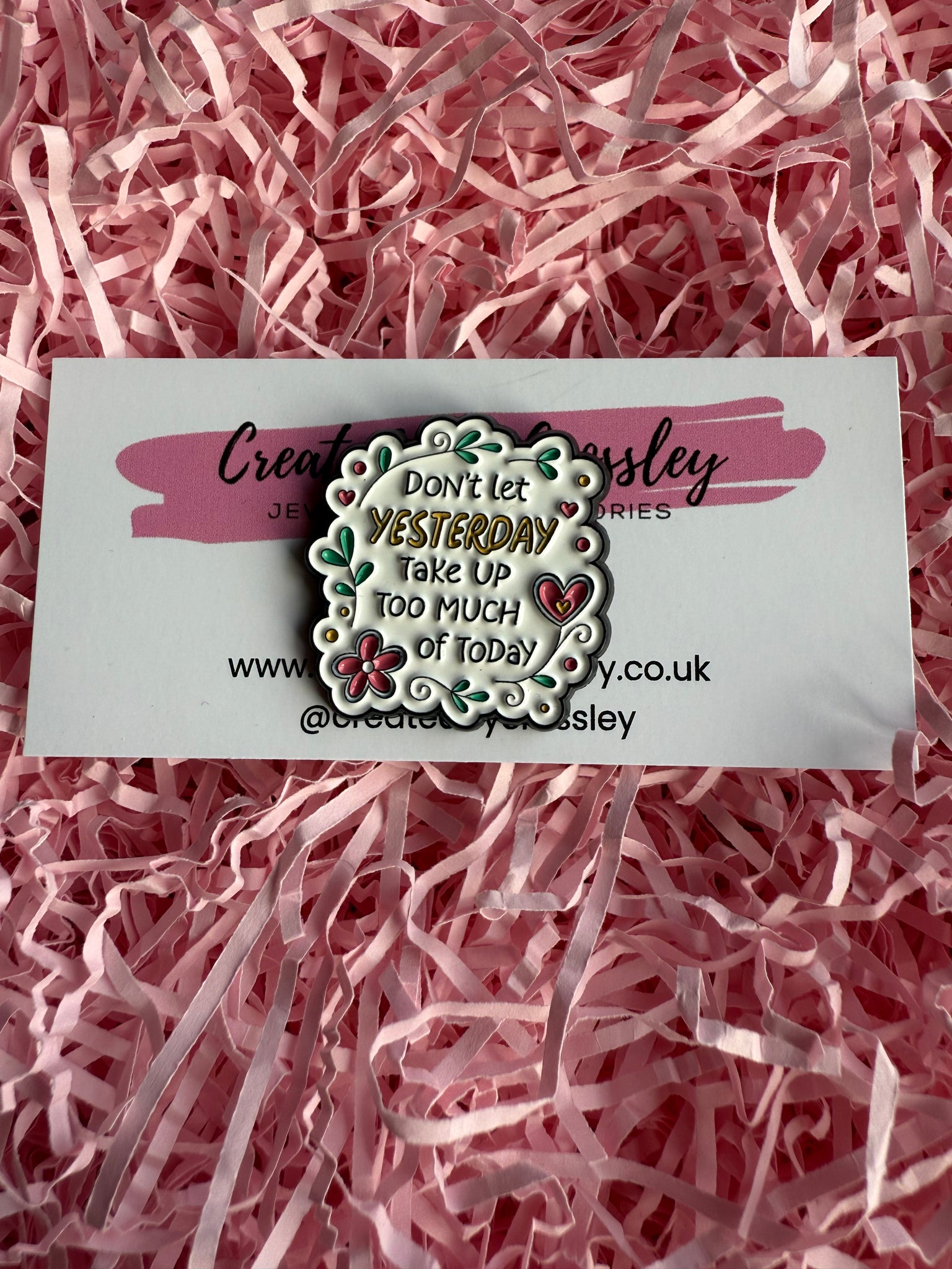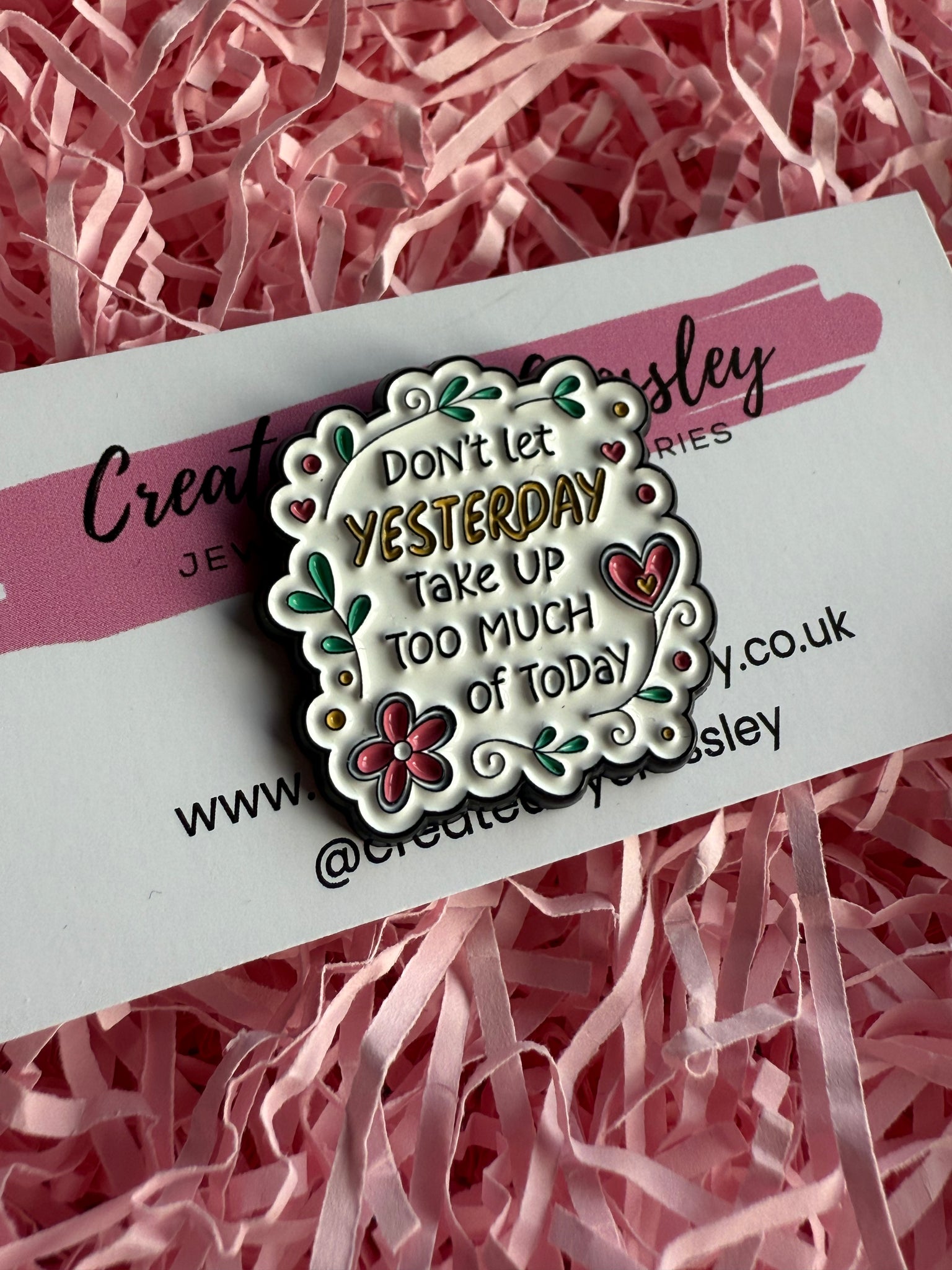 “Don’t let yesterday take up too much of today” Pin Badge. Pin badges can be used on bags, clothing, pencil cases, lanyards and more, to accessorise and add some colour and personality to your items.