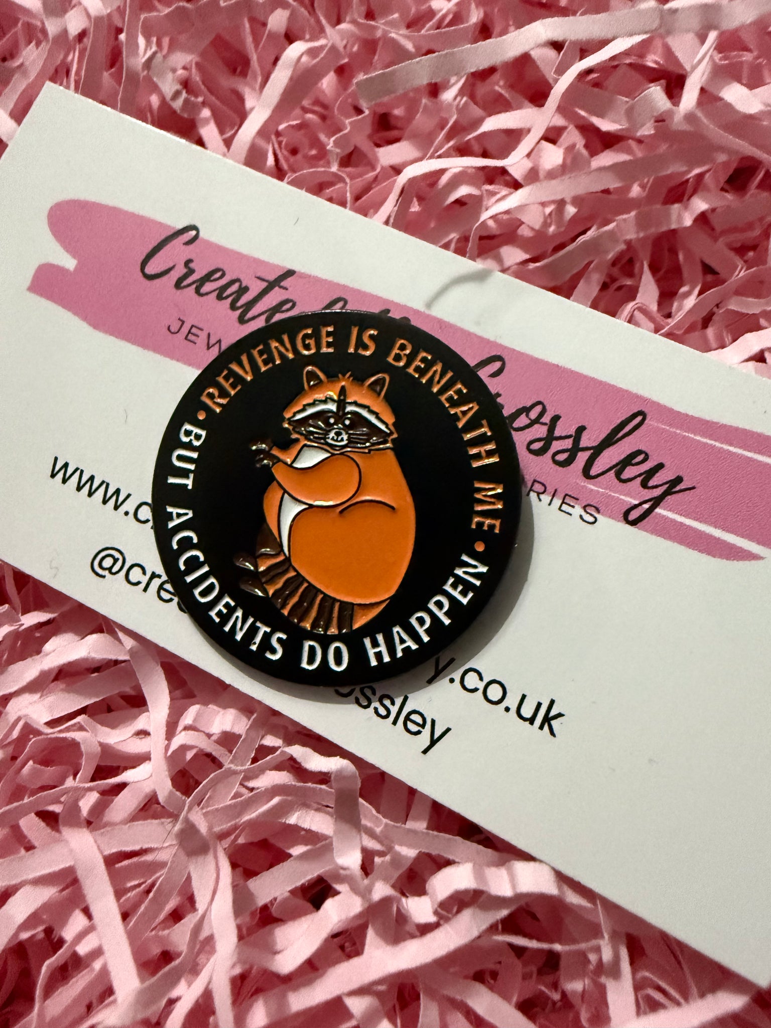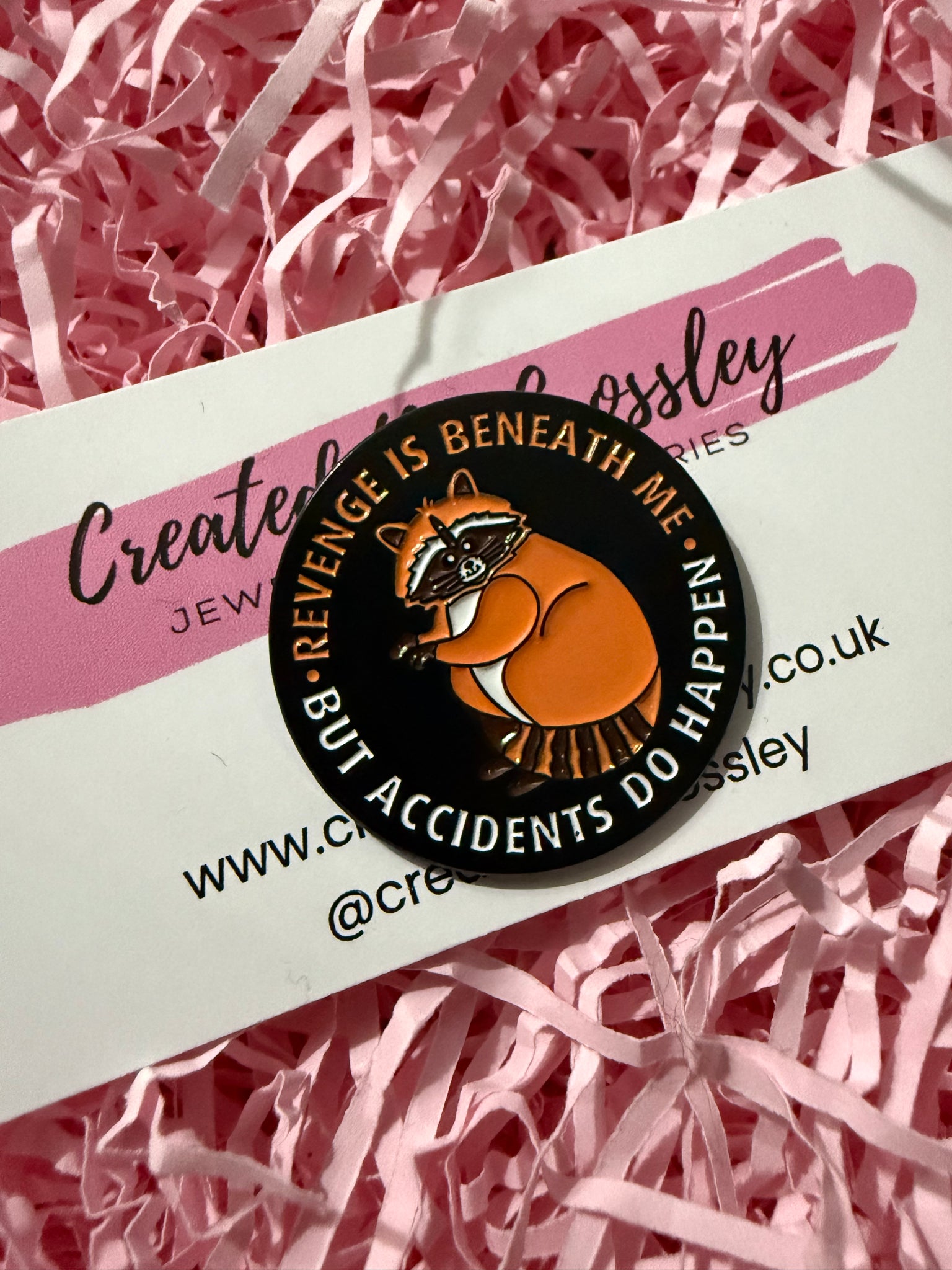 “Revenge is beneath me. But accidents do happen” Raccoon pin badge.