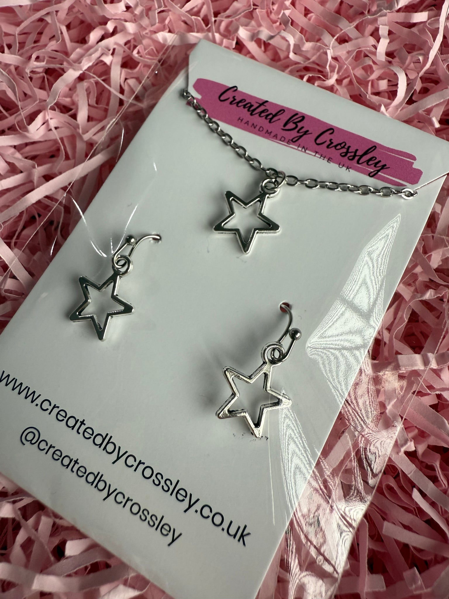 Matching star charm necklace and earrings with stainless steel hooks, perfect for gifting or accessorising your own outfits!