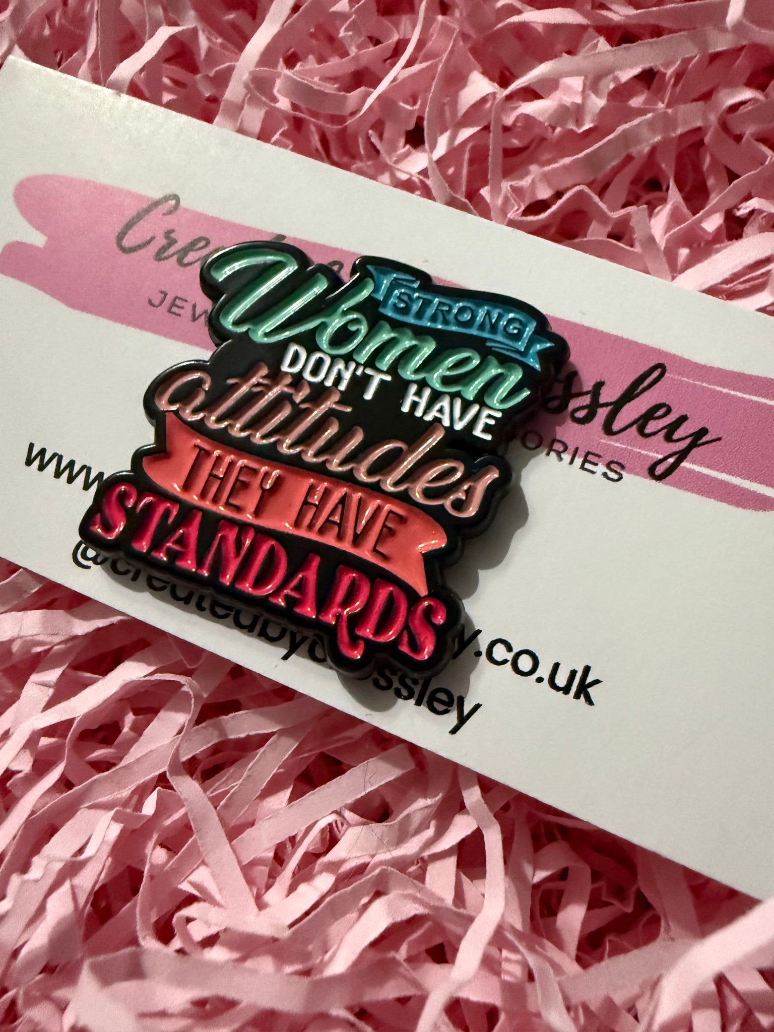“Strong women don’t have attitudes they have standards” pin badge. Pin badges can be used on bags, clothing, pencil cases, lanyards and more, to accessorise and add some colour and personality to your items.