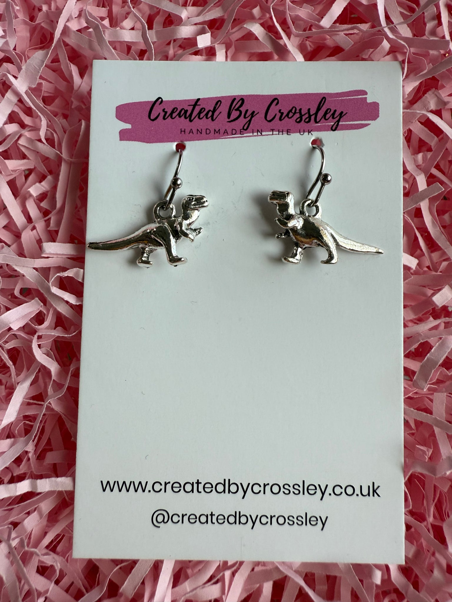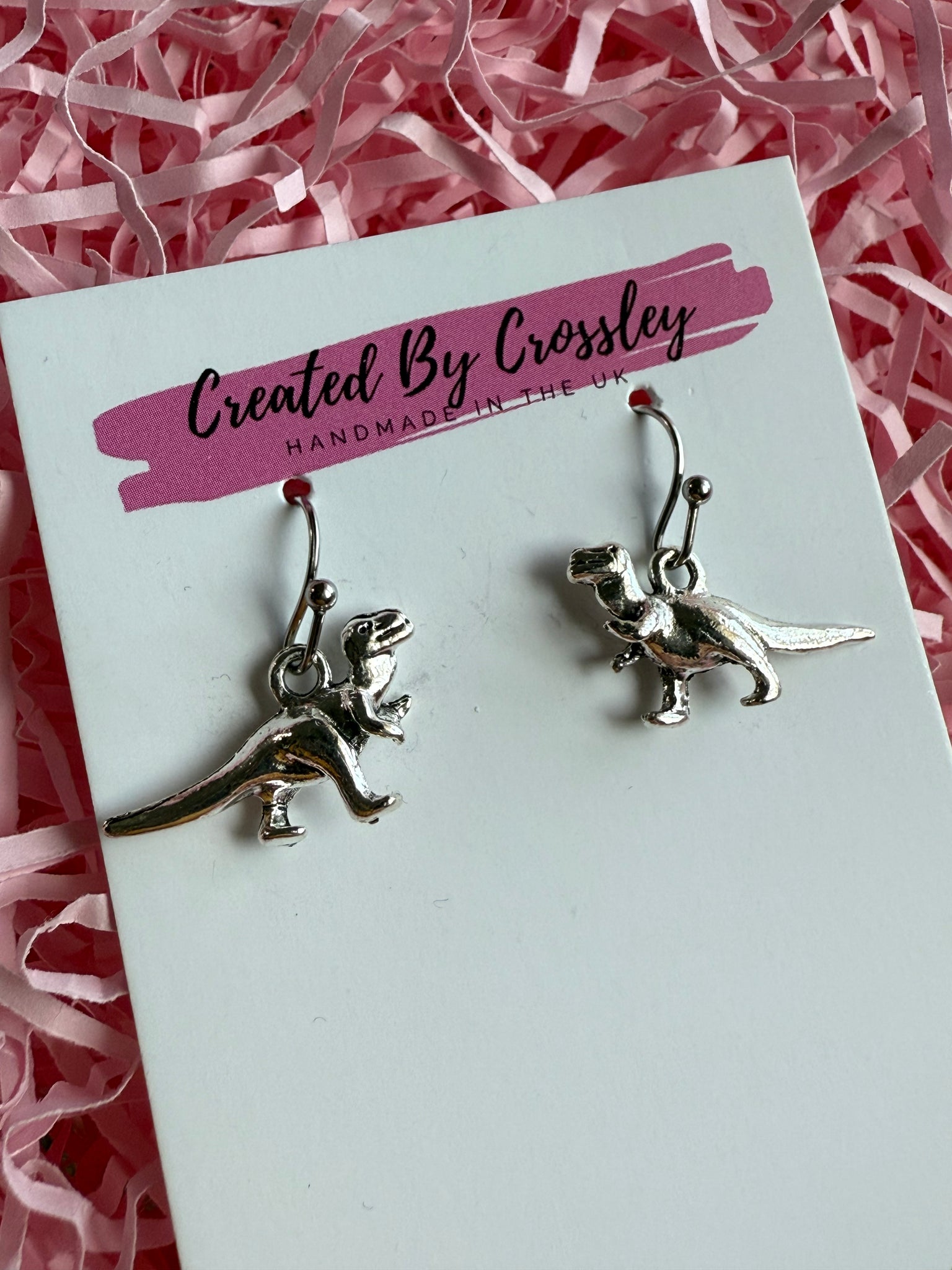 A roarsome pair of dangle Dino earrings, a fun addition to any outfit! Stainless steel hooks.