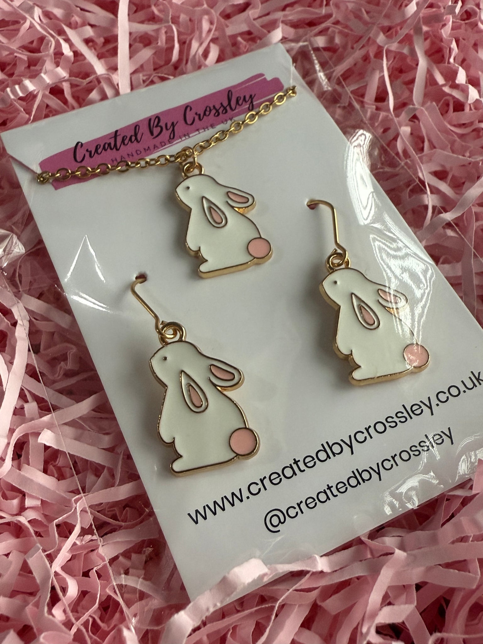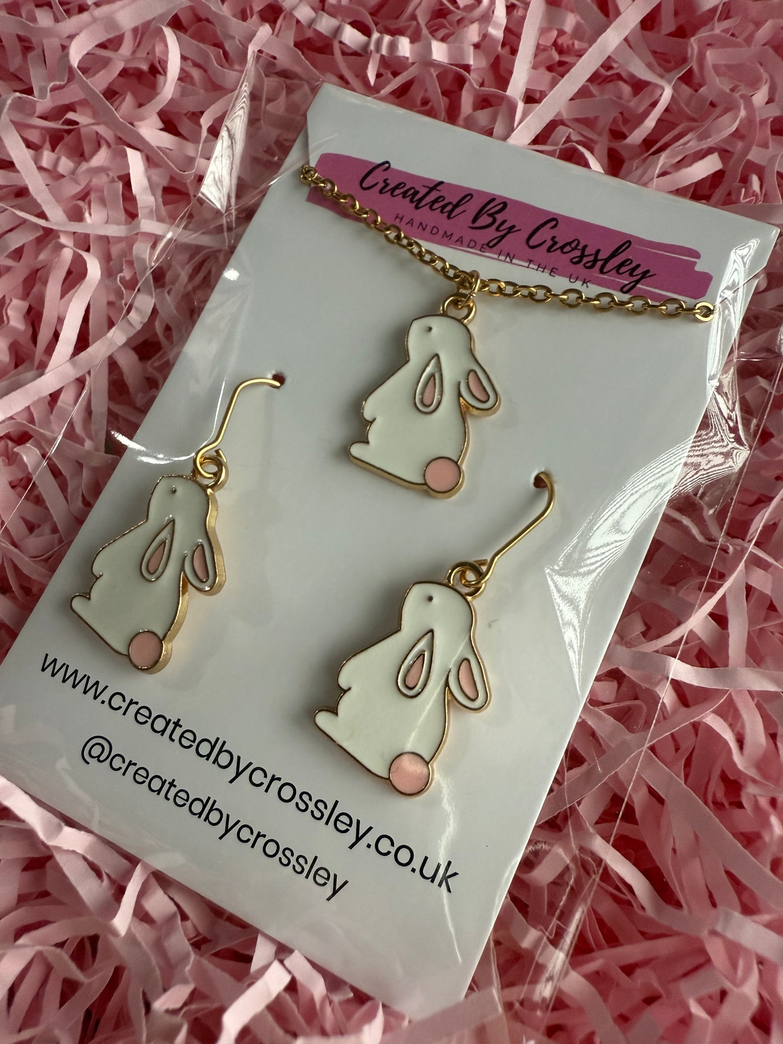 Cute matching white bunny rabbit charm necklace and earrings with stainless steel hooks, perfect for gifting or accessorising your own outfits!
